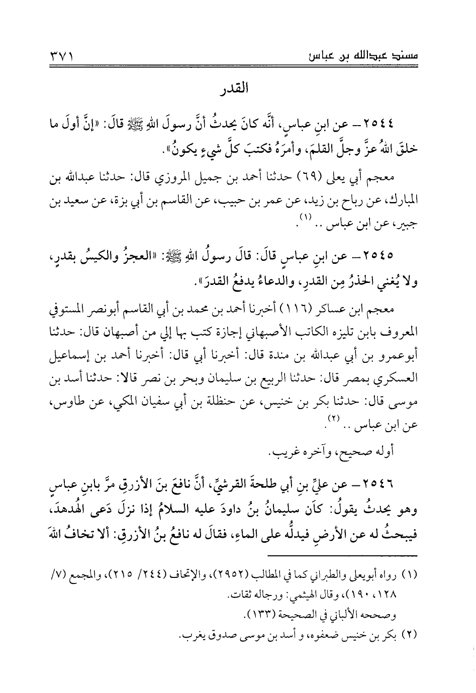 2545 - عن ابنِ عباسٍ قالَ: قالَ رسولُ اللهِ صلى الله عليه وسلم: «العجزُ والكيسُ بقدرٍ، ولا يُغني الحذرُ مِن القدرِ، والدعاءُ يدفعُ القدرَ».