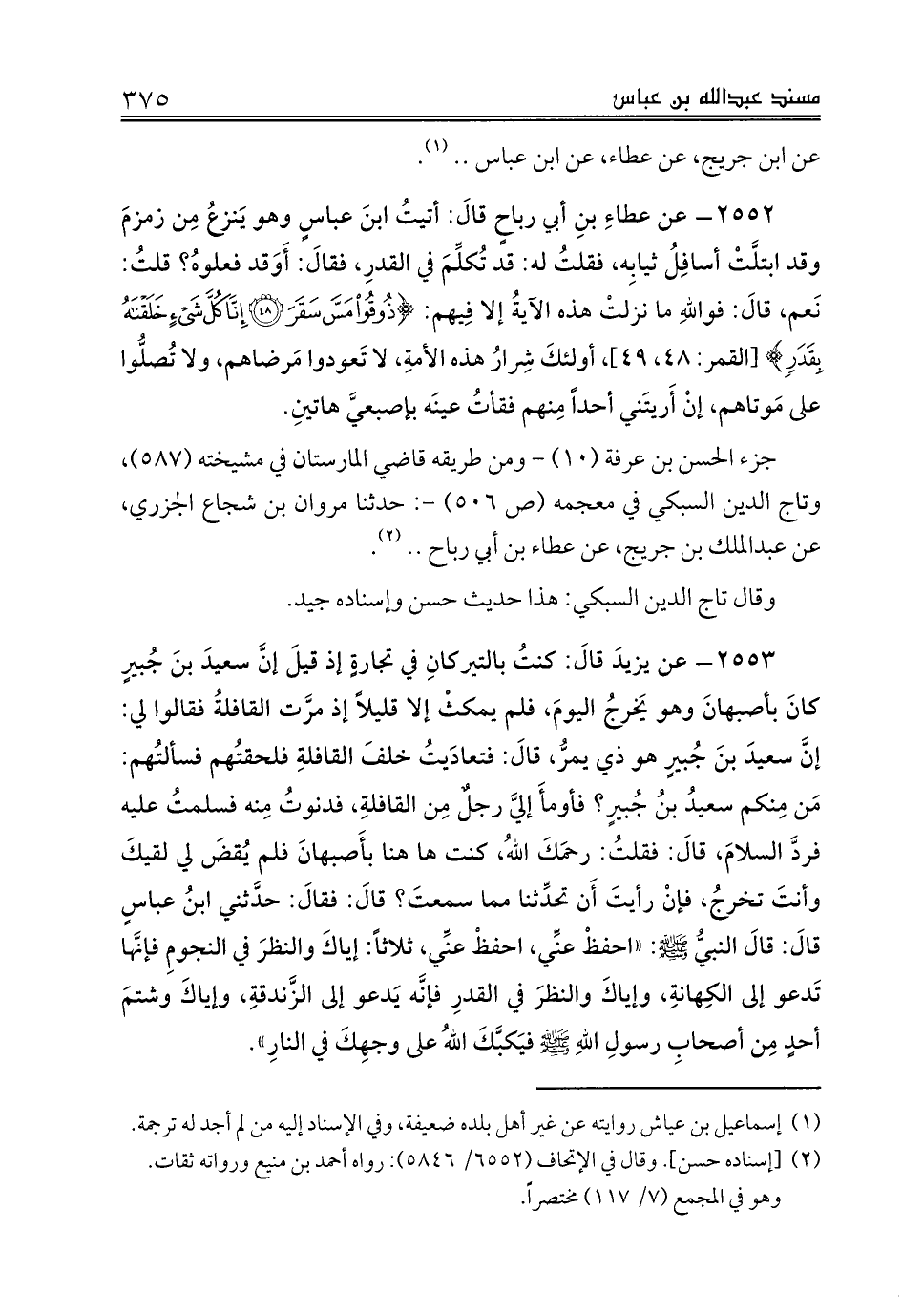 2553 - عن يزيدَ قالَ: كنتُ بالتيركانِ في تجارةٍ إذ قيلَ إنَّ سعيدَ بنَ جُبيرٍ كانَ بأصبهانَ وهو يَخرجُ اليومَ، فلم يمكثْ إلا قليلاً إذ مرَّت القافلةُ فقالوا لي: إنَّ سعيدَ بنَ جُبيرٍ هو ذي يمرُّ، قالَ: فتعادَيتُ خلفَ القافلةِ فلحقتُهم فسألتُهم: مَن مِنكم سعيدُ بنُ جُبيرٍ؟ فأومأَ إليَّ رجلٌ مِن القافلةِ، فدنوتُ مِنه فسلمتُ عليه فردَ السلامَ، قالَ: فقلتُ: رحمَكَ اللهُ، كنت ها هنا بأَصبهانَ فلم يُقضَ لي لقيكَ وأنتَ تخرجُ، فإنْ رأيتَ أَن تحدِّثنا مما سمعتَ؟ قالَ: فقالَ: حدَّثني ابنُ عباسٍ قالَ: قالَ النبيُّ صلى الله عليه وسلم: «احفظْ عنِّي، احفظْ عنِّي، ثلاثاً: إياكَ والنظرَ في النجومِ فإنَّها تَدعو إلى الكِهانةِ، وإياكَ والنظرَ في القدرِ فإنَّه يَدعو إلى الزَّندقةِ، وإياكَ وشتمَ أحدٍ مِن أصحابِ رسولِ اللهِ صلى الله عليه وسلم فيَكبَّكَ اللهُ على وجهِكَ في النارِ».