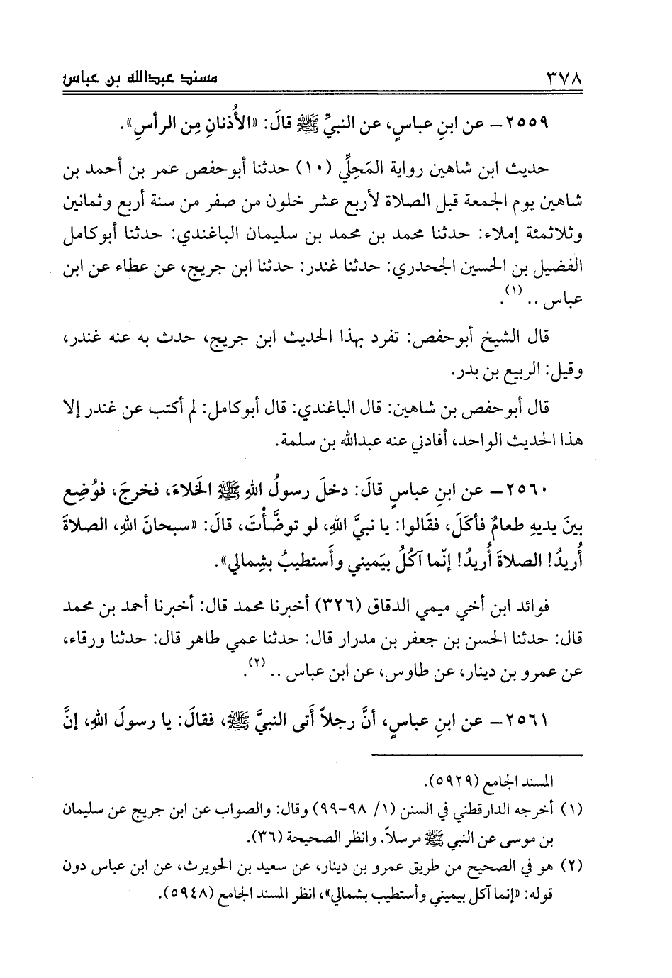(¬2) هو في الصحيح من طريق عمرو بن دينار، عن سعيد بن الحويرث، عن ابن عباس دون قوله: «إنما آكل بيميني وأستطيب بشمالي»، انظر المسند الجامع (5948).