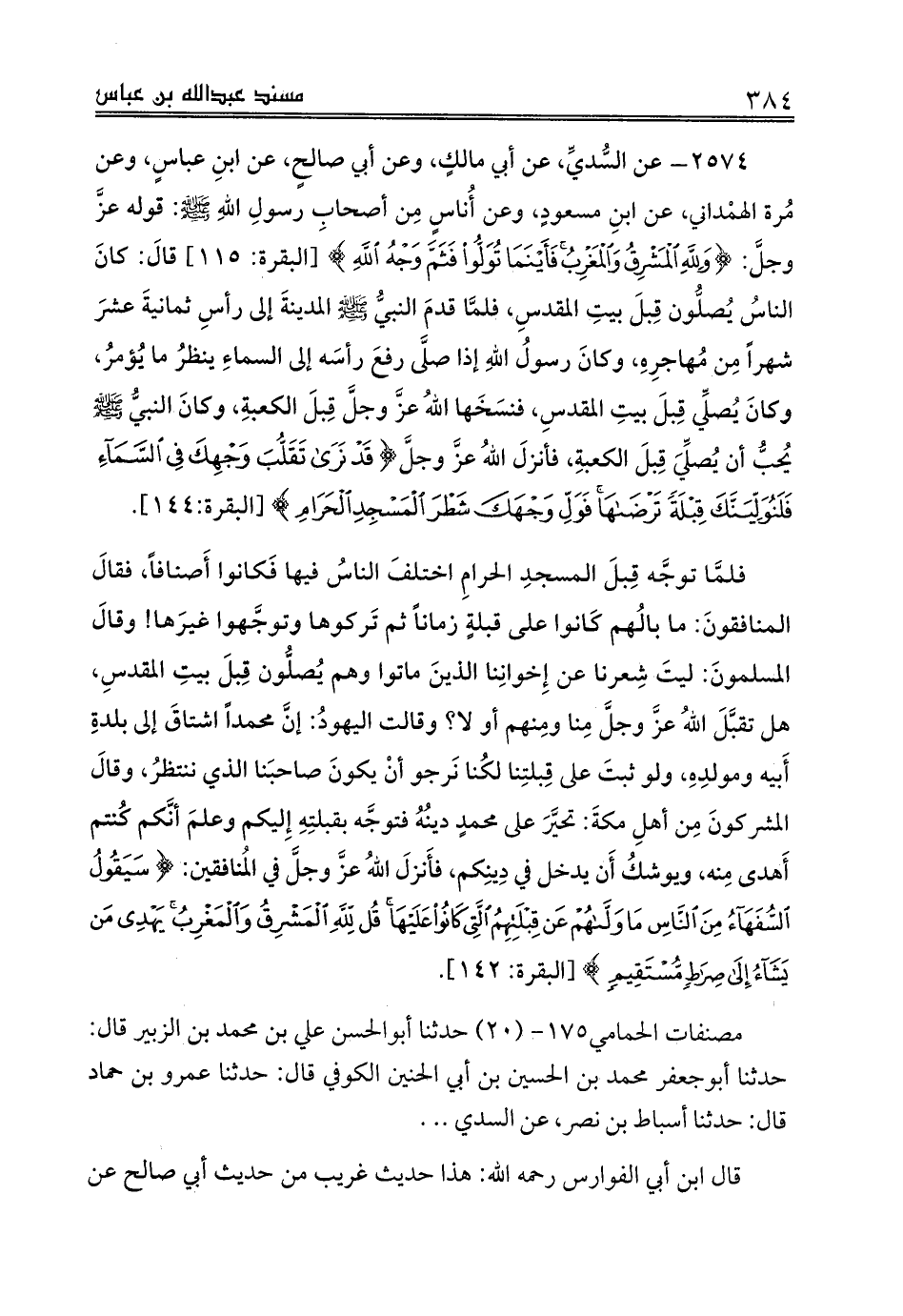 2574 - عن السُّديِّ، عن أبي مالكٍ، وعن أبي صالحٍ، عن ابنِ عباسٍ، وعن مُرة الهمْداني، عن ابنِ مسعودٍ، وعن أُناسٍ مِن أصحابِ رسولِ اللهِ صلى الله عليه وسلم: قوله عزَّ وجلَّ: {وَلِلَّهِ الْمَشْرِقُ وَالْمَغْرِبُ فَأَيْنَمَا تُوَلُّوا فَثَمَّ وَجْهُ اللَّهِ} [البقرة: 115] قالَ: كانَ الناسُ يُصلُّون قِبلَ بيتِ المقدسِ، فلمَّا قدمَ النبيُّ صلى الله عليه وسلم المدينةَ إلى رأسِ ثمانيةَ عشرَ شهراً مِن مُهاجرِهِ، وكانَ رسولُ اللهِ إذا صلَّى رفعَ رأسَه إلى السماءِ ينظرُ ما يُؤمرُ، وكانَ يُصلِّي قِبلَ بيتِ المقدسِ، فنسَخَها اللهُ عزَّ وجلَّ قِبلَ الكعبةِ، وكانَ النبيُّ صلى الله عليه وسلم يُحبُّ أن يُصلِّيَ قِبلَ الكعبةِ، فأنزلَ اللهُ عزَّ وجلَّ {قَدْ نَرَى تَقَلُّبَ وَجْهِكَ فِي السَّمَاءِ فَلَنُوَلِّيَنَّكَ قِبْلَةً تَرْضَاهَا فَوَلِّ وَجْهَكَ شَطْرَ الْمَسْجِدِ الْحَرَامِ} [البقرة:144]،