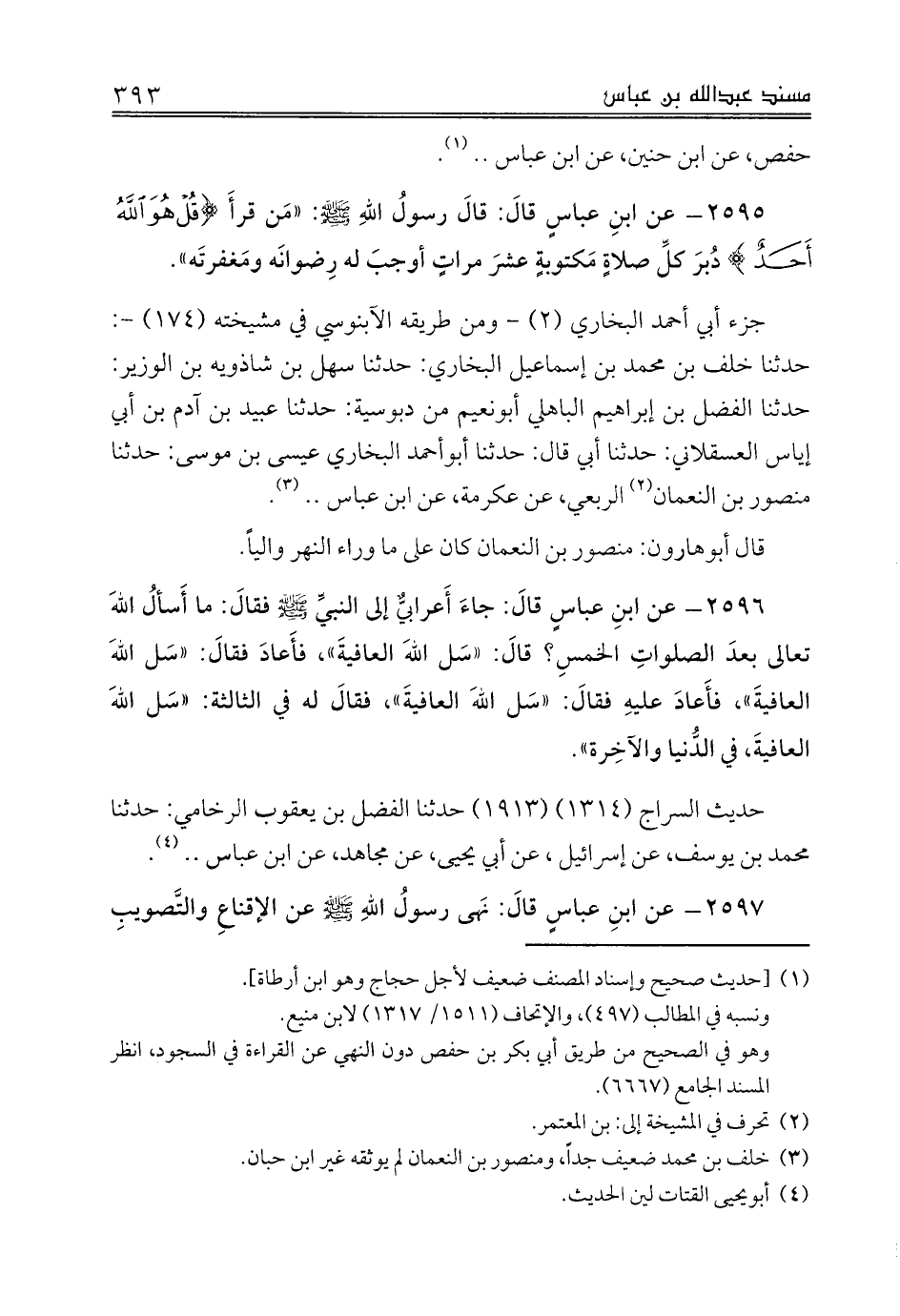 جزء أبي أحمد البخاري (2) - ومن طريقه الآبنوسي في مشيخته (174) -: حدثنا خلف بن محمد بن إسماعيل البخاري: حدثنا سهل بن شاذويه بن الوزير: حدثنا الفضل بن إبراهيم الباهلي أبونعيم من دبوسية: حدثنا عبيد بن آدم بن أبي إياس العسقلاني: حدثنا أبي قال: حدثنا أبوأحمد البخاري عيسى بن موسى: حدثنا منصور بن النعمان (¬2) الربعي، عن عكرمة، عن ابن عباس .. (¬3).