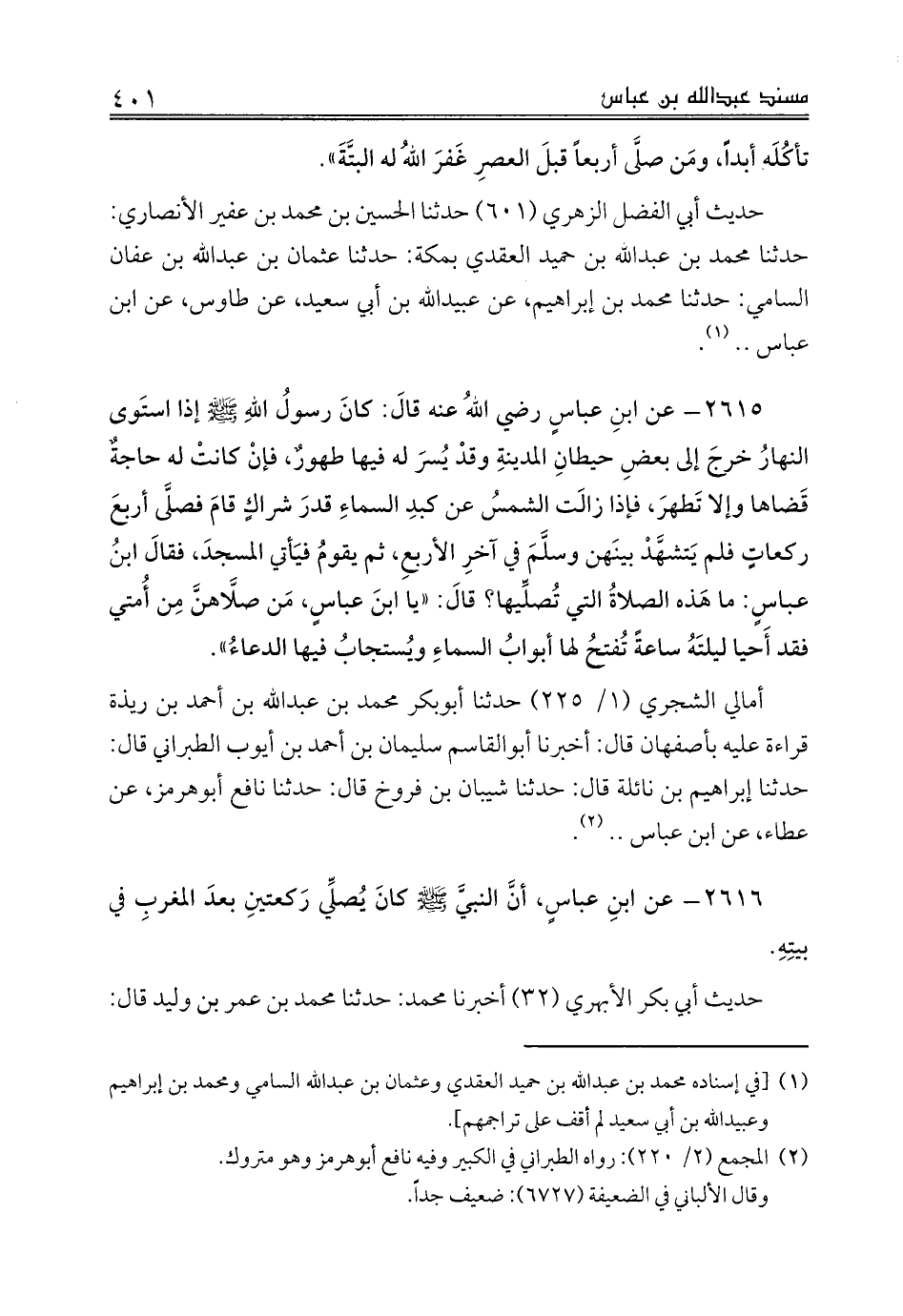 2615 - عن ابنِ عباسٍ رضي اللهُ عنه قالَ: كانَ رسولُ اللهِ صلى الله عليه وسلم إذا استَوى النهارُ خرجَ إلى بعضِ حيطانِ المدينةِ وقدْ يُسرَ له فيها طهورٌ، فإنْ كانتْ له حاجةٌ قَضاها وإلا تَطهرَ، فإذا زالَت الشمسُ عن كبدِ السماءِ قدرَ شراكٍ قامَ فصلَّى أربعَ ركعاتٍ فلم يَتشهَّدْ بينَهن وسلَّمَ في آخرِ الأربعِ، ثم يقومُ فيَأتي المسجدَ، فقالَ ابنُ عباسِ: ما هَذه الصلاةُ التي تُصلِّيها؟ قالَ: «يا ابنَ عباسٍ، مَن صلَّاهنَّ مِن أُمتي فقد أَحيا ليلتَهُ ساعةً تُفتحُ لها أبوابُ السماءِ ويُستجابُ فيها الدعاءُ».