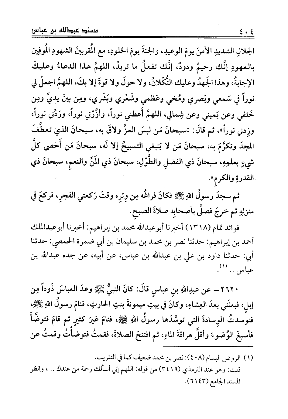 2620 - عن عبدِاللهِ بنِ عباسٍ قالَ: كانَ النبيُّ صلى الله عليه وسلم وعدَ العباسَ ذَوداً مِن إبلٍ، فبعثَني بعدَ العِشاءِ، وكانَ في بيتِ ميمونةَ بنتِ الحارثِ، فنامَ رسولُ اللهِ صلى الله عليه وسلم، فتوسدتُ الوِسادةَ التي توسَّدَها رسولُ اللهِ صلى الله عليه وسلم، فنامَ غيرَ كثيرٍ ثم قامَ فتوضَّأَ فأسبغَ الوُضوءَ وأقلَّ هراقةَ الماءِ، ثم افتتحَ الصلاةَ، فقمتُ فتوضأْتُ وقمتُ عن