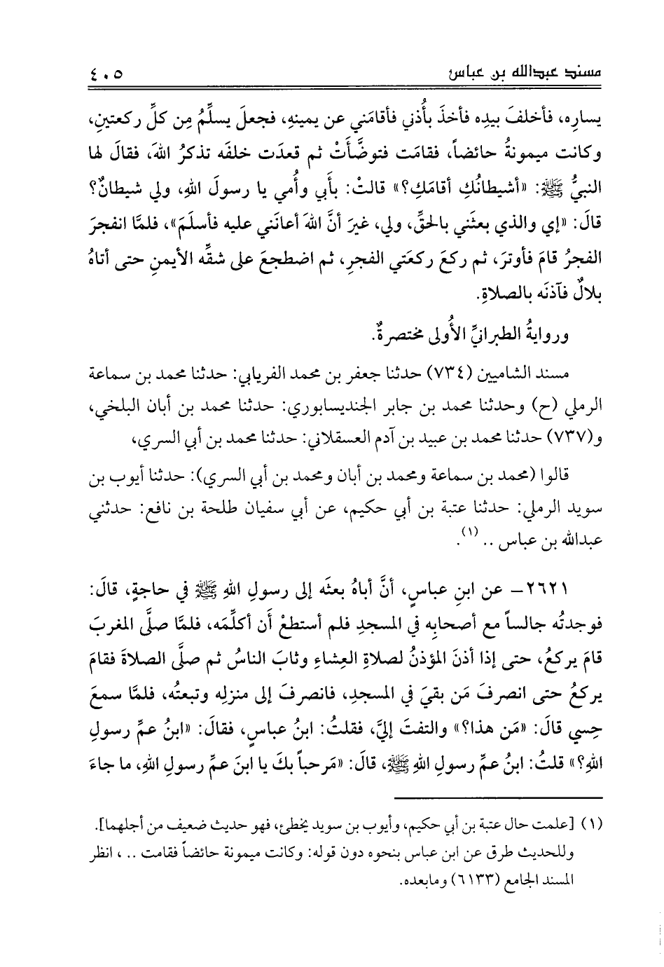 قالوا (محمد بن سماعه ومحمد بن أبان ومحمد بن أبي السري): حدثنا أيوب بن سويد الرملي: حدثنا عتبة بن أبي حكيم، عن أبي سفيان طلحة بن نافع: حدثني عبدالله بن عباس .. (¬1).