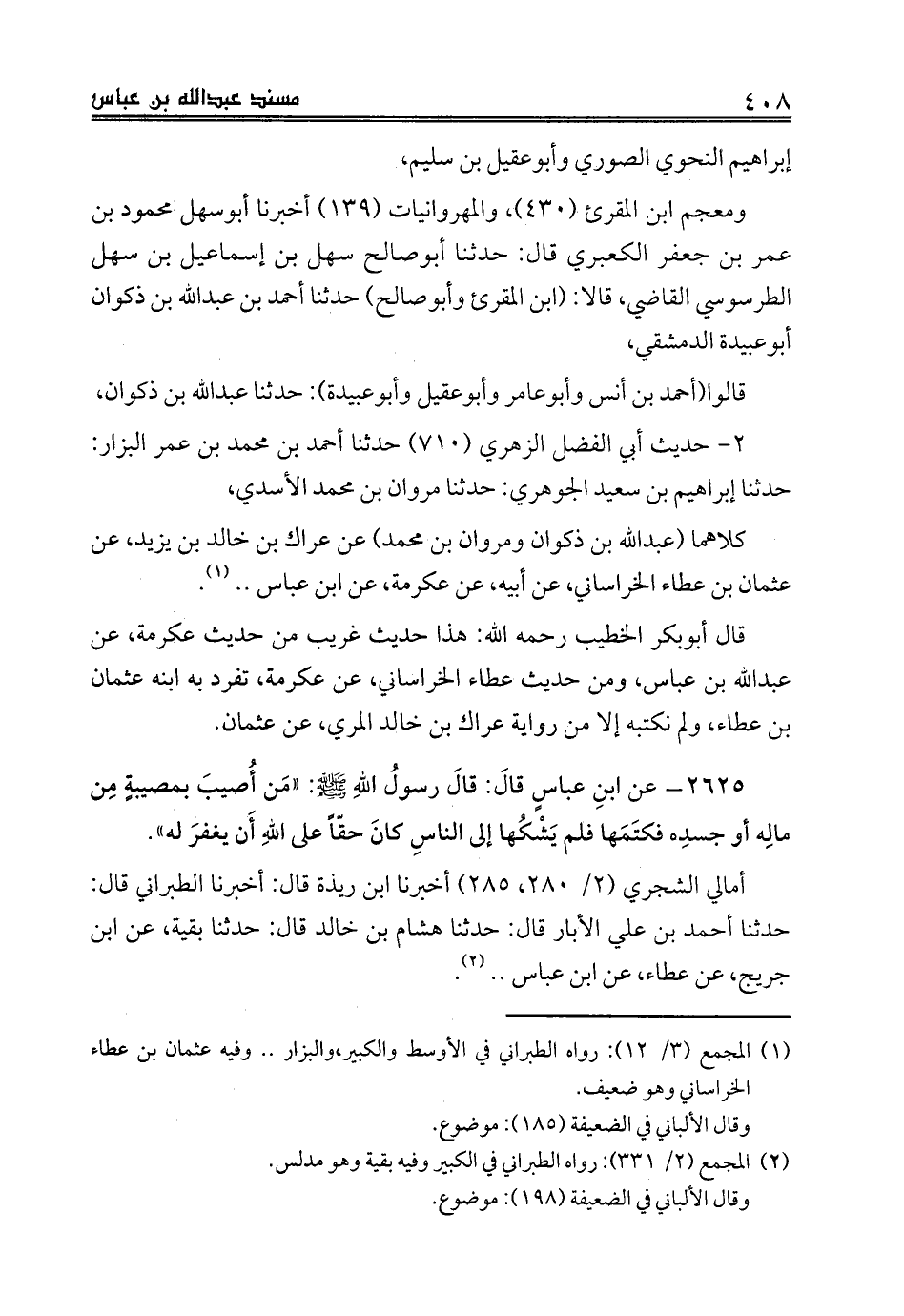كلاهما (عبدالله بن ذكوان ومروان بن محمد) عن عراك بن خالد بن يزيد، عن عثمان بن عطاء الخراساني، عن أبيه، عن عكرمة، عن ابن عباس .. (¬1).