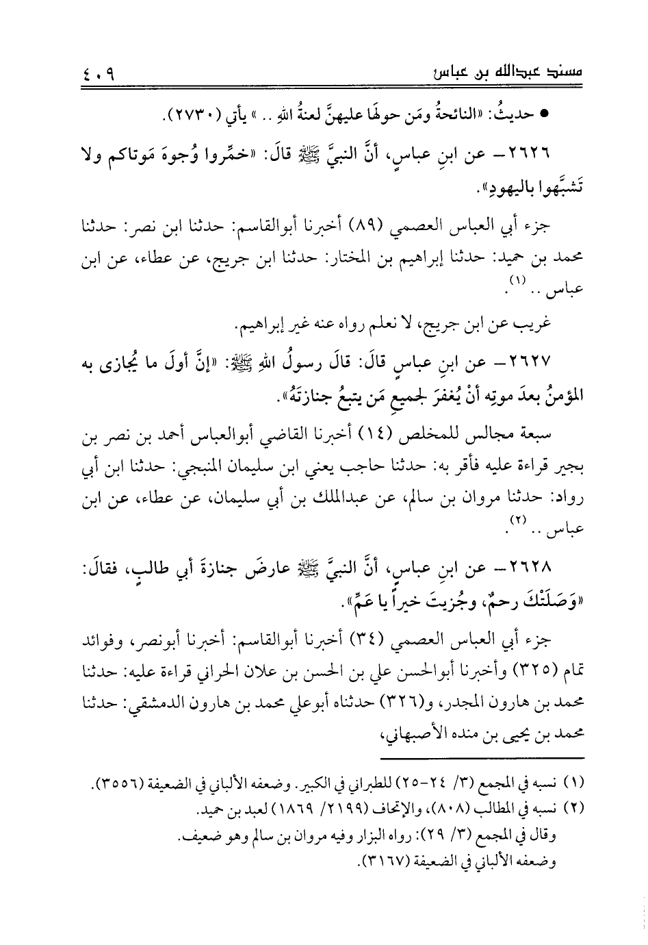 2628 - عن ابنِ عباسٍ، أنَّ النبيَّ صلى الله عليه وسلم عارضَ جنازةَ أبي طالبٍ، فقالَ: «وَصَلَتْكَ رحمٌ، وجُزيتَ خيراً يا عَمِّ».