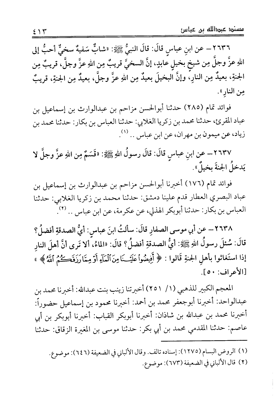 2636 - عن ابنِ عباسٍ قالَ: قالَ النبيُّ صلى الله عليه وسلم: «شابٌّ سَفيهٌ سخيٌّ أحبُّ إلى اللهِ عزَّ وجلَّ مِن شيخٍ بخيلٍ عابدٍ، إنَّ السخيَّ قريبٌ مِن اللهِ عزَّ وجلَّ، قريبٌ مِن الجنةِ، بعيدٌ مِن النارِ، وإنَّ البخيلَ بعيدٌ مِن اللهِ عزَّ وجلَّ، بعيدٌ مِن الجنةِ، قريبٌ مِن النارِ».