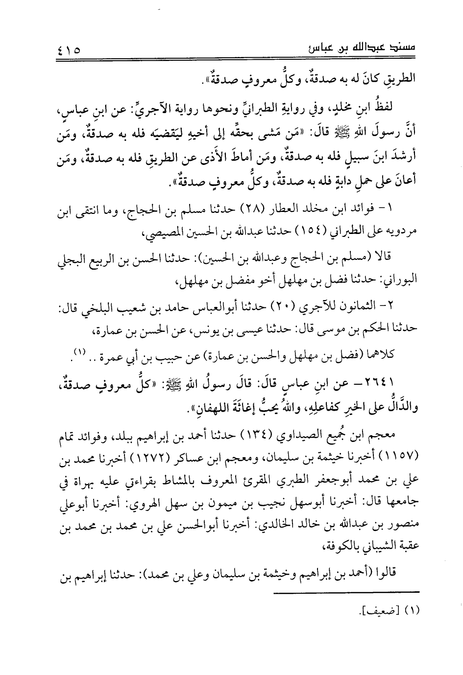 لفظُ ابنِ مخلدٍ، وفي روايةِ الطبرانيِّ ونحوها رواية الآجريِّ: عن ابنِ عباسٍ، أنَّ رسولَ اللهِ صلى الله عليه وسلم قالَ: «مَن مَشى بحقِّه إلى أخيهِ ليَقضيَه فله به صدقةٌ، ومَن أرشدَ ابنَ سبيلٍ فله به صدقةٌ، ومَن أماطَ الأَذى عن الطريقِ فله به صدقةٌ، ومَن أعانَ على حملِ دابةٍ فله به صدقةٌ، وكلُّ معروفٍ صدقةٌ».