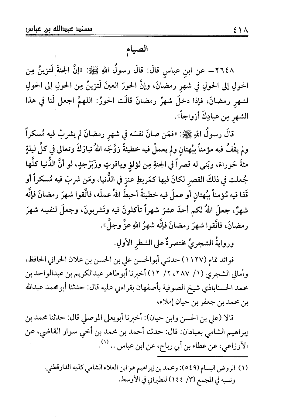 2648 - عن ابنِ عباسٍ قالَ: قالَ رسولُ اللهِ صلى الله عليه وسلم: «إنَّ الجنةَ لَتزينُ مِن الحولِ إلى الحولِ في شهرِ رمضانَ، وإنَّ الحورَ العينَ لَتزينُ مِن الحولِ إلى الحولِ لشهرِ رمضانَ، فإذا دخلَ شهرُ رمضانَ قالَت الحورُ: اللهمَّ اجعل لَنا في هذا الشهرِ مِن عبادِكَ أزواجاً».