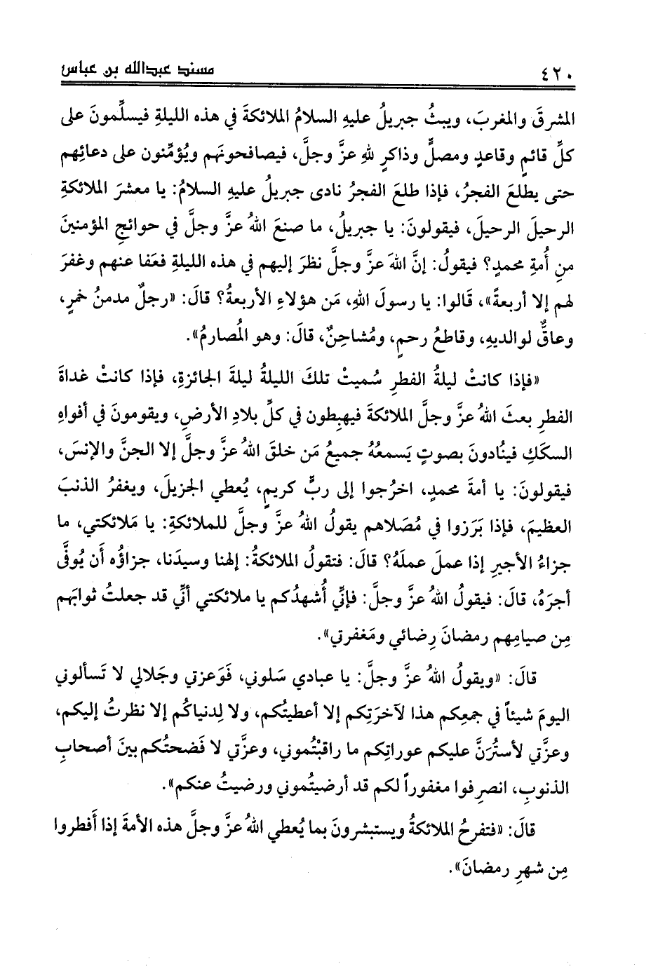 المشرقَ والمغربَ، ويبثُ جبريلُ عليهِ السلامُ الملائكةَ في هذه الليلةِ فيسلِّمونَ على كلِّ قائمٍ وقاعدٍ ومصلٍّ وذاكرٍ للهِ عزَّ وجلَّ، فيصافحونَهم ويُؤمِّنون على دعائِهم حتى يطلعَ الفجرُ، فإذا طلعَ الفجرُ نادى جبريلُ عليهِ السلامُ: يا معشرَ الملائكةِ الرحيلَ الرحيلَ، فيقولونَ: يا جبريلُ، ما صنعَ اللهُ عزَّ وجلَّ في حوائجِ المؤمنينَ منِ أُمةِ محمدٍ؟ فيقولُ: إنَّ اللهَ عزَّ وجلَّ نظرَ إليهم في هذه الليلةِ فعَفا عنهم وغفرَ لهم إلا أربعةً»، قَالوا: يا رسولَ اللهِ، مَن هؤلاءِ الأربعةُ؟ قالَ: «رجلٌ مدمنُ خمرٍ، وعاقٌّ لوالديهِ، وقاطعُ رحمٍ، ومُشاحِنٌ، قالَ: وهو المُصارمُ».