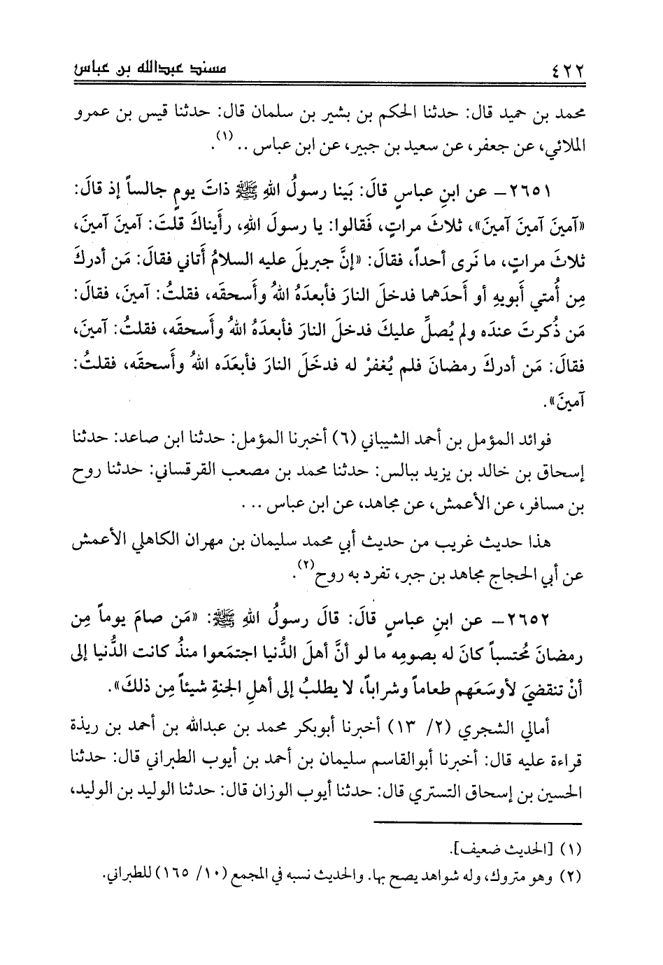2651 - عن ابنِ عباسٍ قالَ: بَينا رسولُ اللهِ صلى الله عليه وسلم ذاتَ يومٍ جالساً إذ قالَ: «آمينَ آمينَ آمينَ»، ثلاثَ مراتٍ، فَقالوا: يا رسولَ اللهِ، رأَيناكَ قلتَ: آمينَ آمينَ، ثلاثَ مراتٍ، ما نَرى أحداً، فقالَ: «إنَّ جبريلَ عليه السلامُ أَتاني فقالَ: مَن أدركَ مِن أُمتي أَبويهِ أو أَحدَهما فدخلَ النارَ فأبعدَهُ اللهُ وأَسحقَه، فقلتُ: آمينَ، فقالَ: مَن ذُكرتَ عندَه ولم يُصلِّ عليكَ فدخلَ النارَ فأبعدَهُ اللهُ وأَسحقَه، فقلتُ: آمينَ، فقالَ: مَن أدركَ رمضانَ فلم يُغفرْ له فدخَلَ النارَ فأبعَدَه اللهُ وأَسحقَه، فقلتُ: آمينَ».