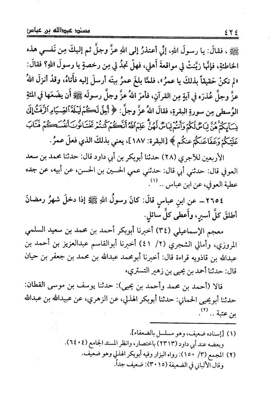 الأربعين للآجري (28) حدثنا أبوبكر بن أبي داود قال: حدثنا محمد بن سعد العوفي قال: حدثني أبي قال: حدثني عمي الحسين بن الحسن، عن أبيه، عن جده عطية العوفي، عن ابن عباس .. (¬1).