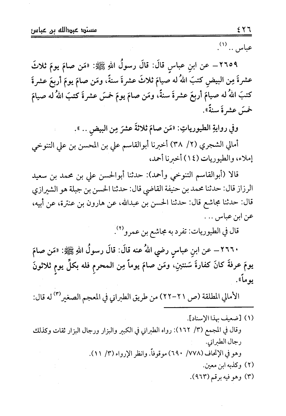 2660 - عن ابنِ عباسٍ رضي اللهُ عنه قالَ: قالَ رسولُ اللهِ صلى الله عليه وسلم: «مَن صامَ يومَ عرفةَ كانَ كفارةَ سَنتينِ، ومَن صامَ يوماً مِن المحرمِ فله بكلِّ يومٍ ثلاثونَ يوماً».