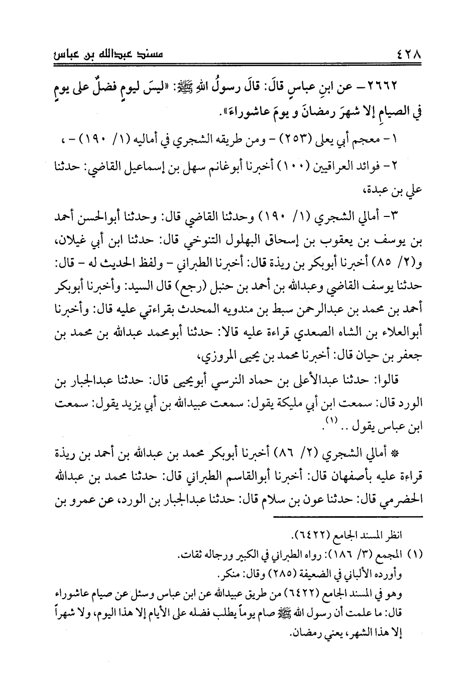 2662 - عن ابنِ عباسٍ قالَ: قالَ رسولُ اللهِ صلى الله عليه وسلم: «ليسَ ليومٍ فضلٌ على يومٍ في الصيامِ إلا شهرَ رمضانَ و يومَ عاشوراءَ».