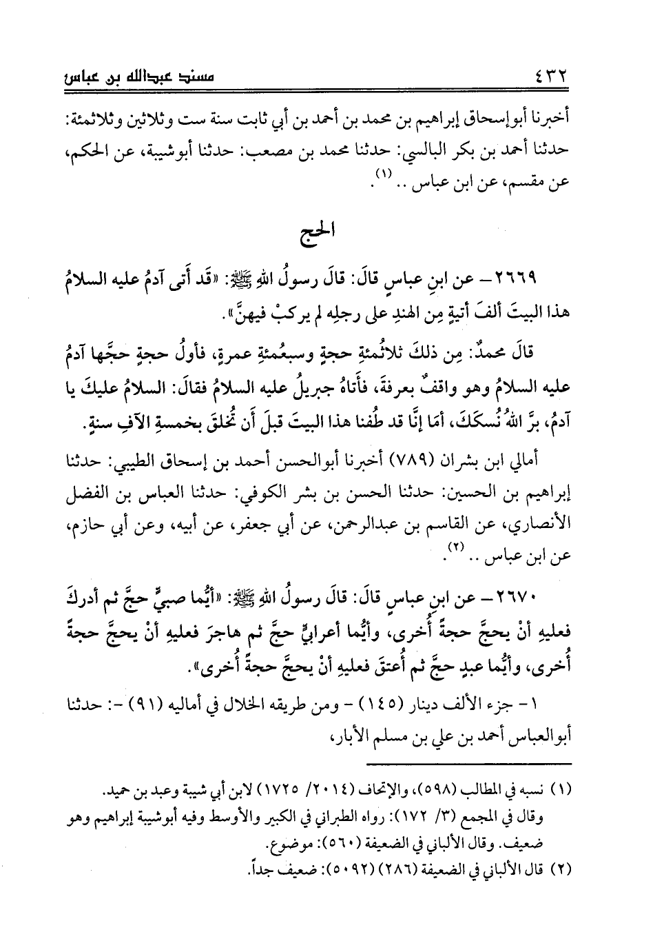 2669 - عن ابنِ عباسٍ قالَ: قالَ رسولُ اللهِ صلى الله عليه وسلم: «قَد أَتى آدمُ عليه السلامُ هذا البيتَ ألفَ أتيةٍ مِن الهندِ على رجلِه لم يركبْ فيهنَّ».