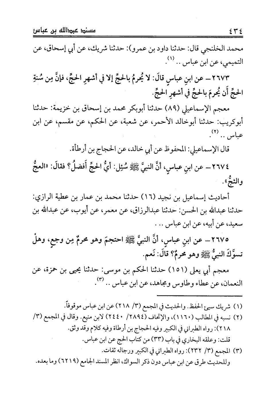(¬2) نسبه في المطالب (1160)، والإتحاف (2894/ 2440) لابن منيع. وقال في المجمع (3/ 218): رواه الطبراني في الكبير وفيه الحجاج بن أرطاة وفيه كلام وقد وثق.