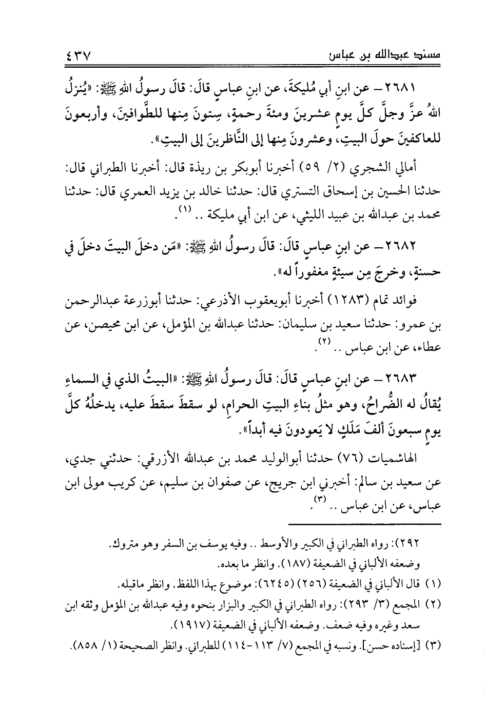 2683 - عن ابنِ عباسٍ قالَ: قالَ رسولُ اللهِ صلى الله عليه وسلم: «البيتُ الذي في السماءِ يُقالُ له الضُّراحُ، وهو مثلُ بناءِ البيتِ الحرامِ، لو سقطَ سقطَ عليه، يدخلُهُ كلَّ يومٍ سبعونَ ألفَ مَلَكٍ لا يَعودونَ فيه أبداً».