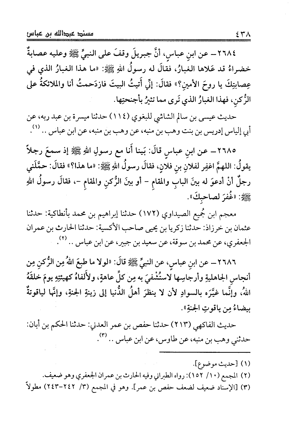 2684 - عن ابنِ عباسٍ، أنَّ جبريلَ وقفَ على النبيِّ صلى الله عليه وسلم وعليه عصابةٌ خضراءُ قد عَلاها الغبارُ، فقالَ له رسولُ اللهِ صلى الله عليه وسلم: «ما هذا الغبارُ الذي في عِصابتِكَ يا روحَ الأمينِ؟» فقالَ: إنِّي أَتيتُ البيتَ فازدَحمتُ أنا والملائكةُ على الرُّكنِ، فهذا الغبارُ الذي تَرى مما تثيرُ بأجنحتِها.