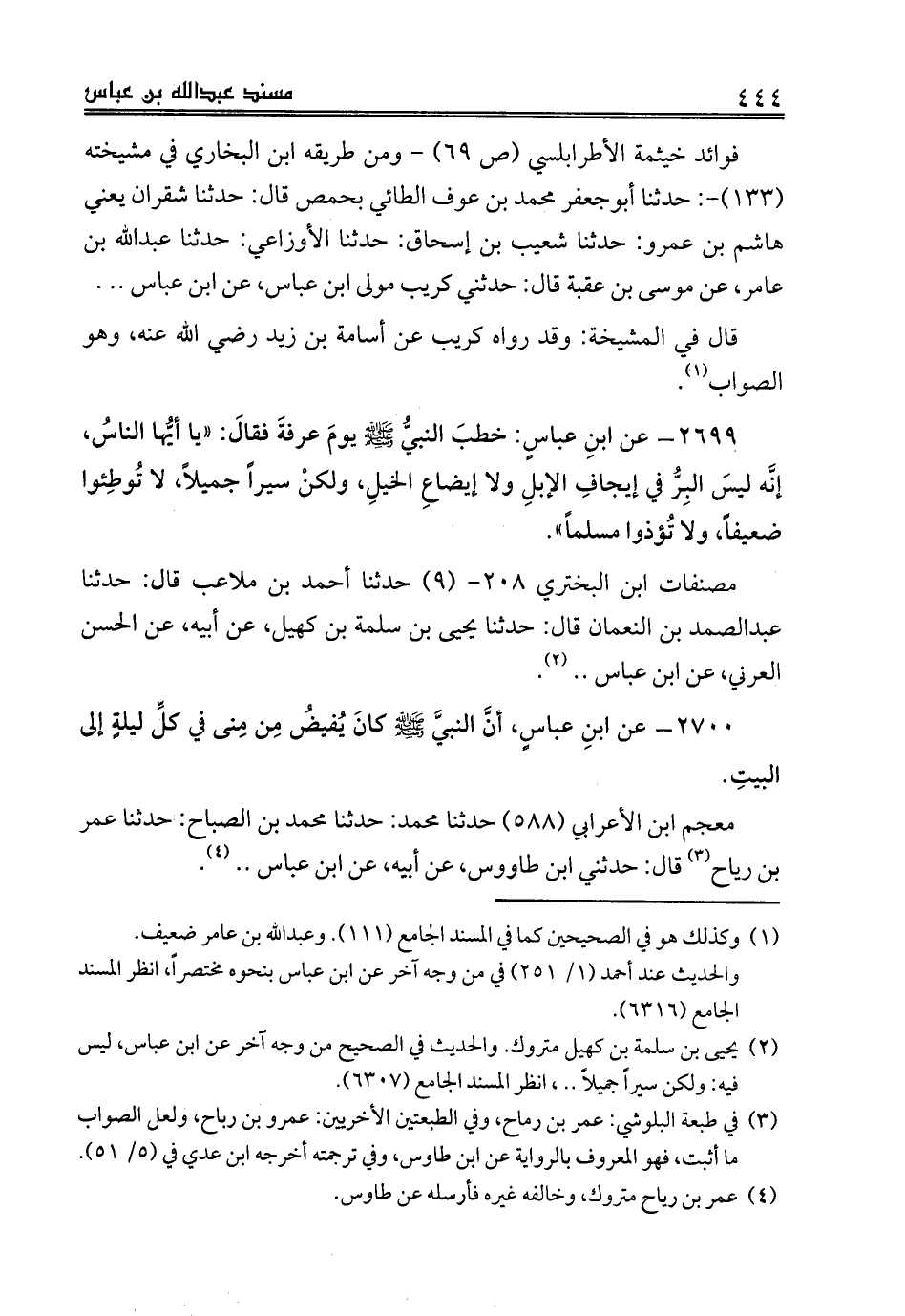 2699 - عن ابنِ عباسٍ: خطبَ النبيُّ صلى الله عليه وسلم يومَ عرفةَ فقالَ: «يا أيُّها الناسُ، إنَّه ليسَ البِرُّ في إيجافِ الإبلِ ولا إيضاعِ الخيلِ، ولكنْ سيراً جميلاً، لا تُوطِئوا ضعيفاً، ولا تُؤذوا مسلماً».