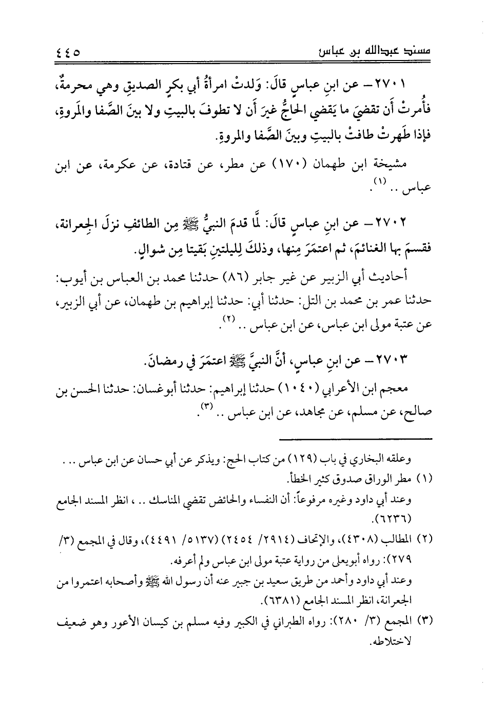 2701 - عن ابنِ عباسٍ قالَ: وَلدتْ امرأةُ أبي بكرٍ الصديقِ وهي محرمةٌ، فأُمرتْ أَن تقضيَ ما يَقضي الحاجُّ غيرَ أَن لا تطوفَ بالبيتِ ولا بينَ الصَّفا والمَروةِ، فإذا طَهرتْ طافتْ بالبيتِ وبينَ الصَّفا والمروةِ.