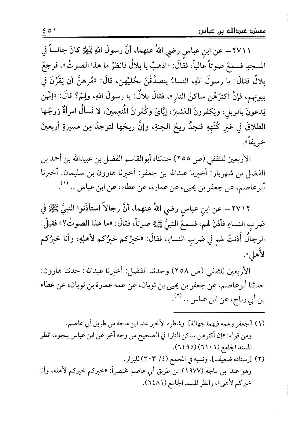 الأربعين للثقفي (ص 258) وحدثنا الفضل: أخبرنا عبدالله: حدثنا هارون: حدثنا أبوعاصم، عن جعفر بن يحيى بن ثوبان، عن عمه عمارة بن ثوبان، عن عطاء بن أبي رباح، عن ابن عباس .. (¬2).
