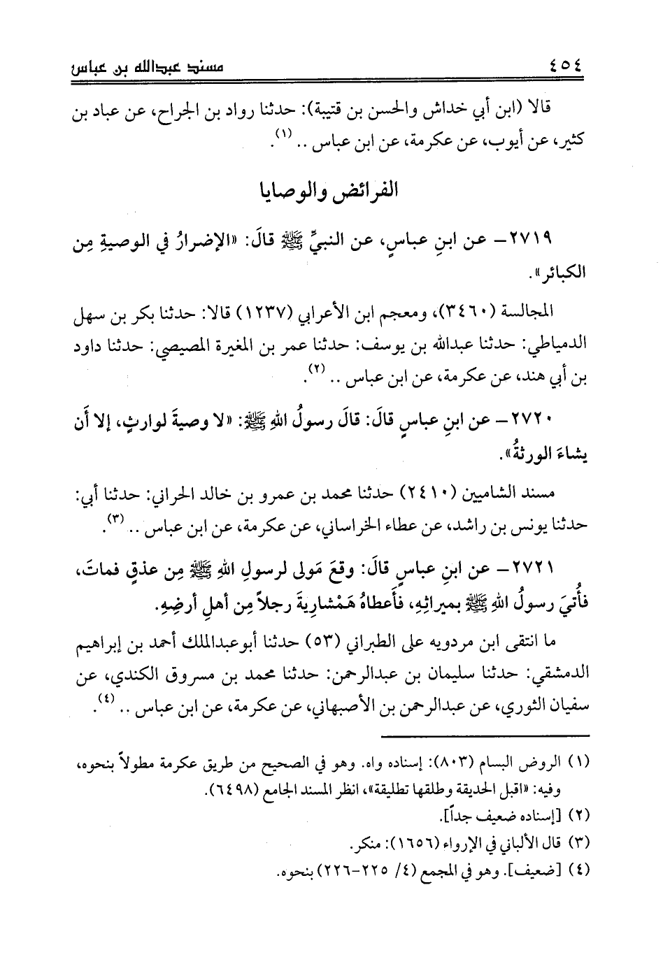 2719 - عن ابنِ عباسٍ، عن النبيِّ صلى الله عليه وسلم قالَ: «الإضرارُ في الوصيةِ مِن الكبائر».