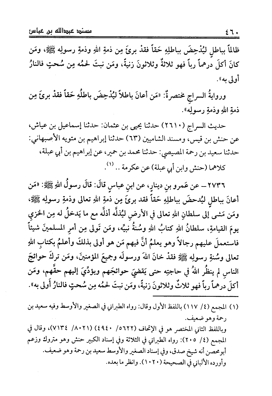 2736 - عن عَمرو بنِ دينارٍ، عن ابنِ عباسٍ قالَ: قالَ رسولُ اللهِ صلى الله عليه وسلم: «مَن أعانَ بباطلٍ ليُدحضَ بباطلِهِ حَقاً فقد برئَ مِن ذمةِ اللهِ تعالى وذمةِ رسولِه صلى الله عليه وسلم، ومَن مَشى إلى سلطانِ اللهِ تعالى في الأرضِ ليُذلَّه أذلَّه مع ما يَدخلُ له مِن الخزيِ يومَ القيامةِ، سلطانُ اللهِ كتابُ اللهِ وسُنةُ نبيِّه، ومَن تَولى مِن أمرِ المسلمينَ شيئاً فاستعملَ عليهم رجالاً وهو يعلمُ أنَّ فيهم مَن هو أولى بذلكَ وأعلمُ بكتابِ اللهِ تعالى وسُنةِ رسولِه صلى الله عليه وسلم فقدْ خانَ اللهَ ورسولَه وجميعَ المؤمنينَ، ومَن تركَ حوائجَ الناسِ لم ينظُر اللهُ في حاجتِه حتى يَقضيَ حوائجَهم ويؤدِّيَ إليهم حقَّهم، ومَن أكلَ درهماً رباً فهو ثلاثٌ وثلاثونَ زنيةً، ومَن نبتَ لحمُه مِن سُحتٍ فالنارُ أَولى به».