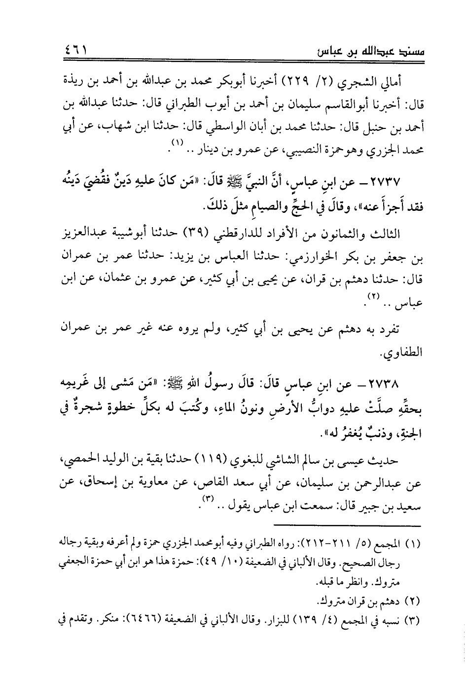 2738 - عن ابنِ عباسٍ قالَ: قالَ رسولُ اللهِ صلى الله عليه وسلم: «مَن مَشى إلى غَريمِه بحقِّهِ صلَّتْ عليهِ دوابُّ الأرضِ ونونُ الماءِ، وكُتبَ له بكلِّ خطوةٍ شجرةٌ في الجنةِ، وذنبٌ يُغفرُ له».