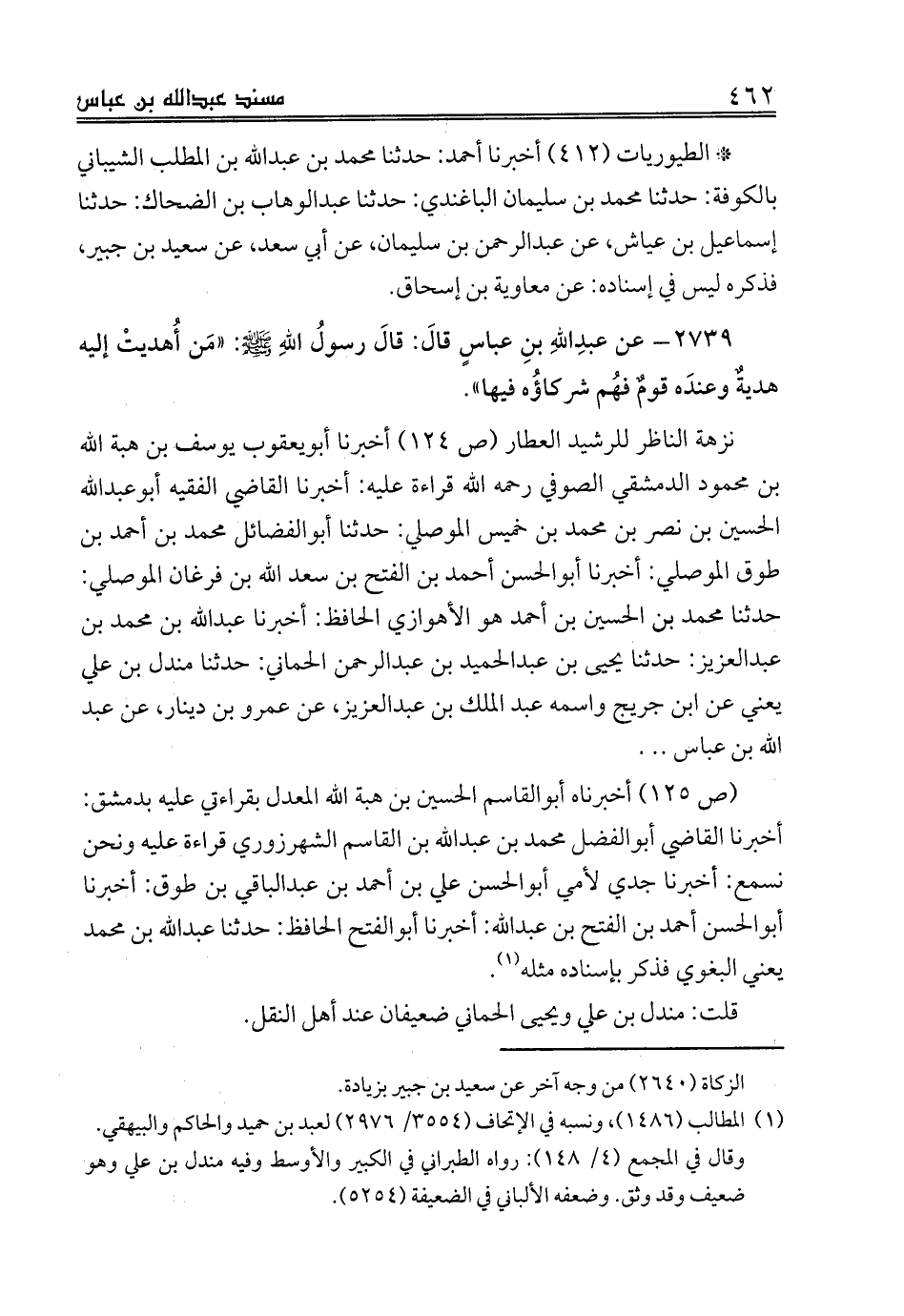 نزهة الناظر للرشيد العطار (ص 124) أخبرنا أبويعقوب يوسف بن هبة الله بن محمود الدمشقي الصوفي رحمه الله قراءة عليه: أخبرنا القاضي الفقيه أبوعبدالله الحسين بن نصر بن محمد بن خميس الموصلي: حدثنا أبوالفضائل محمد بن أحمد بن طوق الموصلي: أخبرنا أبوالحسن أحمد بن الفتح بن سعد الله بن فرغان الموصلي: حدثنا محمد بن الحسين بن أحمد هو الأهوازي الحافظ: أخبرنا عبدالله بن محمد بن عبدالعزيز: حدثنا يحيى بن عبدالحميد بن عبدالرحمن الحماني: حدثنا مندل بن علي يعني عن ابن جريج واسمه عبد الملك بن عبدالعزيز، عن عمرو بن دينار، عن عبد الله بن عباس .. .