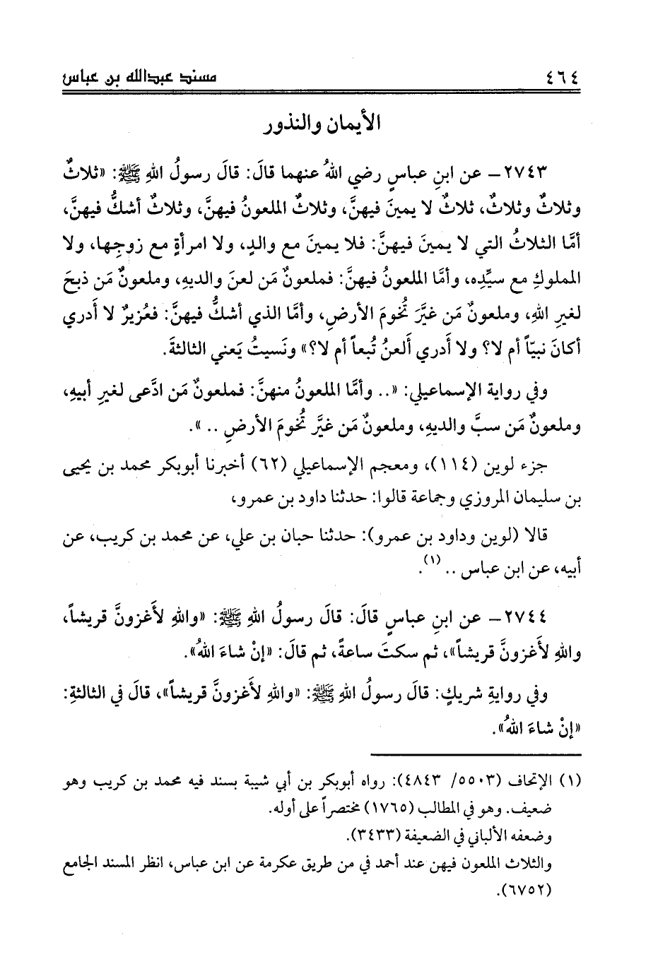 2743 - عن ابنِ عباسٍ رضي اللهُ عنهما قالَ: قالَ رسولُ اللهِ صلى الله عليه وسلم: «ثلاثٌ وثلاثٌ وثلاثٌ، ثلاثٌ لا يمينَ فيهنَّ، وثلاثٌ الملعونُ فيهنَّ، وثلاثٌ أشكُّ فيهنَّ، أمَّا الثلاثُ التي لا يمينَ فيهنَّ: فلا يمينَ مع والدٍ، ولا امرأةٍ مع زوجِها، ولا المملوكِ مع سيِّدِه، وأمَّا الملعونُ فيهنَّ: فملعونٌ مَن لعنَ والديهِ، وملعونٌ مَن ذبحَ لغيرِ اللهِ، وملعونٌ مَن غيَّرَ تُخومَ الأرضِ، وأمَّا الذي أشكُّ فيهنَّ: فعُزيرٌ لا أَدري أكانَ نبيّاً أم لا؟ ولا أَدري أَلعنُ تُبعاً أم لا؟» ونَسيتُ يَعني الثالثةَ.