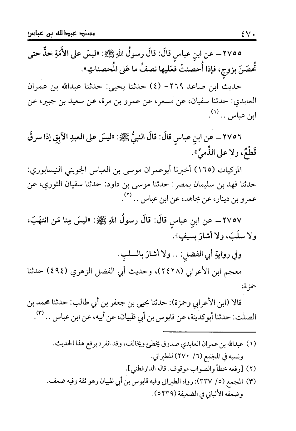 2757 - عن ابنِ عباسٍ قالَ: قالَ رسولُ اللهِ صلى الله عليه وسلم: «ليسَ مِنا مَن انتهَبَ، ولا سلَبَ، ولا أشارَ بسيفٍ».