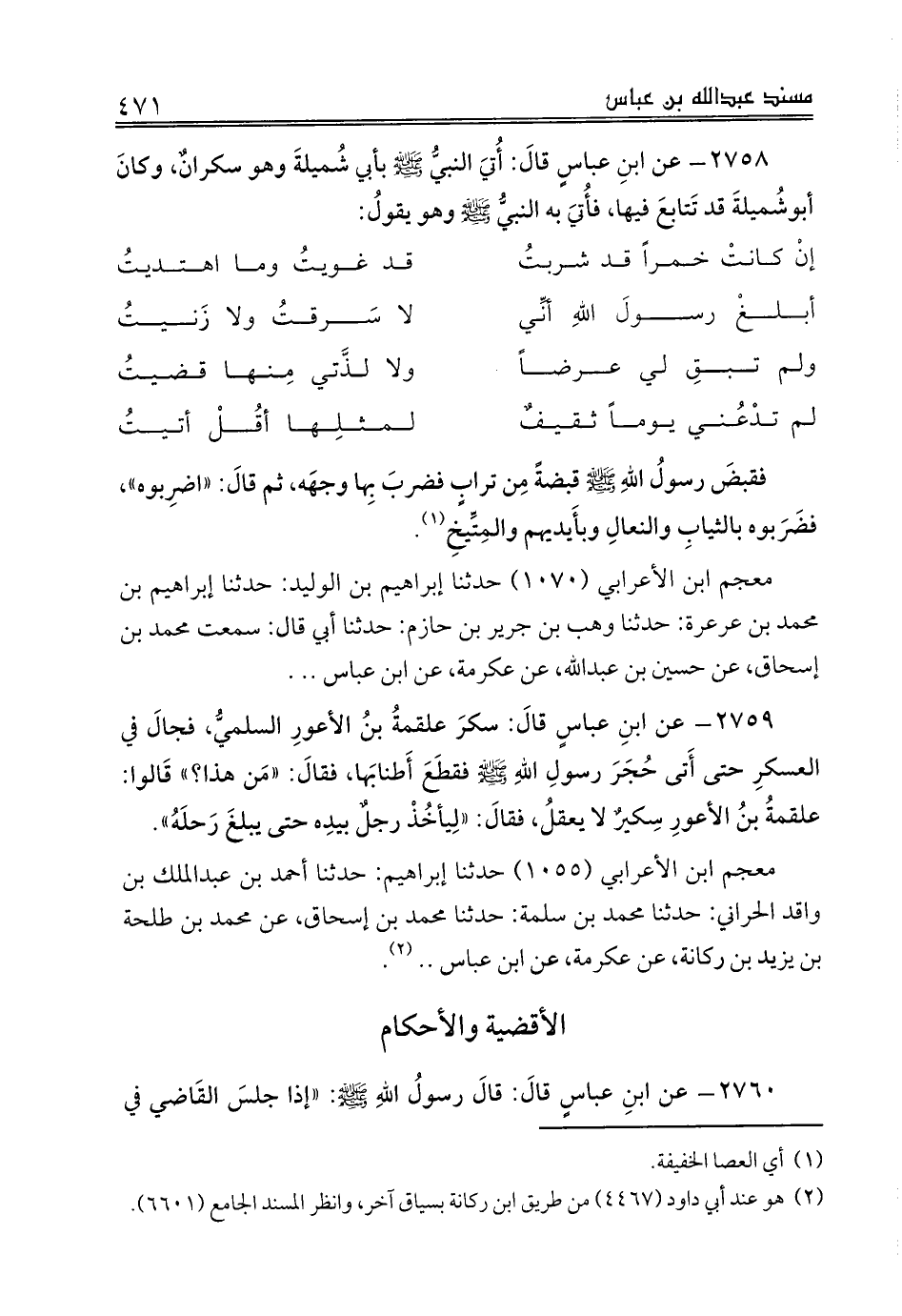 2759 - عن ابنِ عباسٍ قالَ: سكرَ علقمةُ بنُ الأعورِ السلميُّ، فجالَ في العسكرِ حتى أَتى حُجَرَ رسولِ اللهِ صلى الله عليه وسلم فقطَعَ أَطنابَها، فقالَ: «مَن هذا؟» قَالوا: علقمةُ بنُ الأعورِ سِكيرٌ لا يعقلُ، فقالَ: «لِيأخُذْ رجلٌ بيدِه حتى يبلغَ رَحلَهُ».
