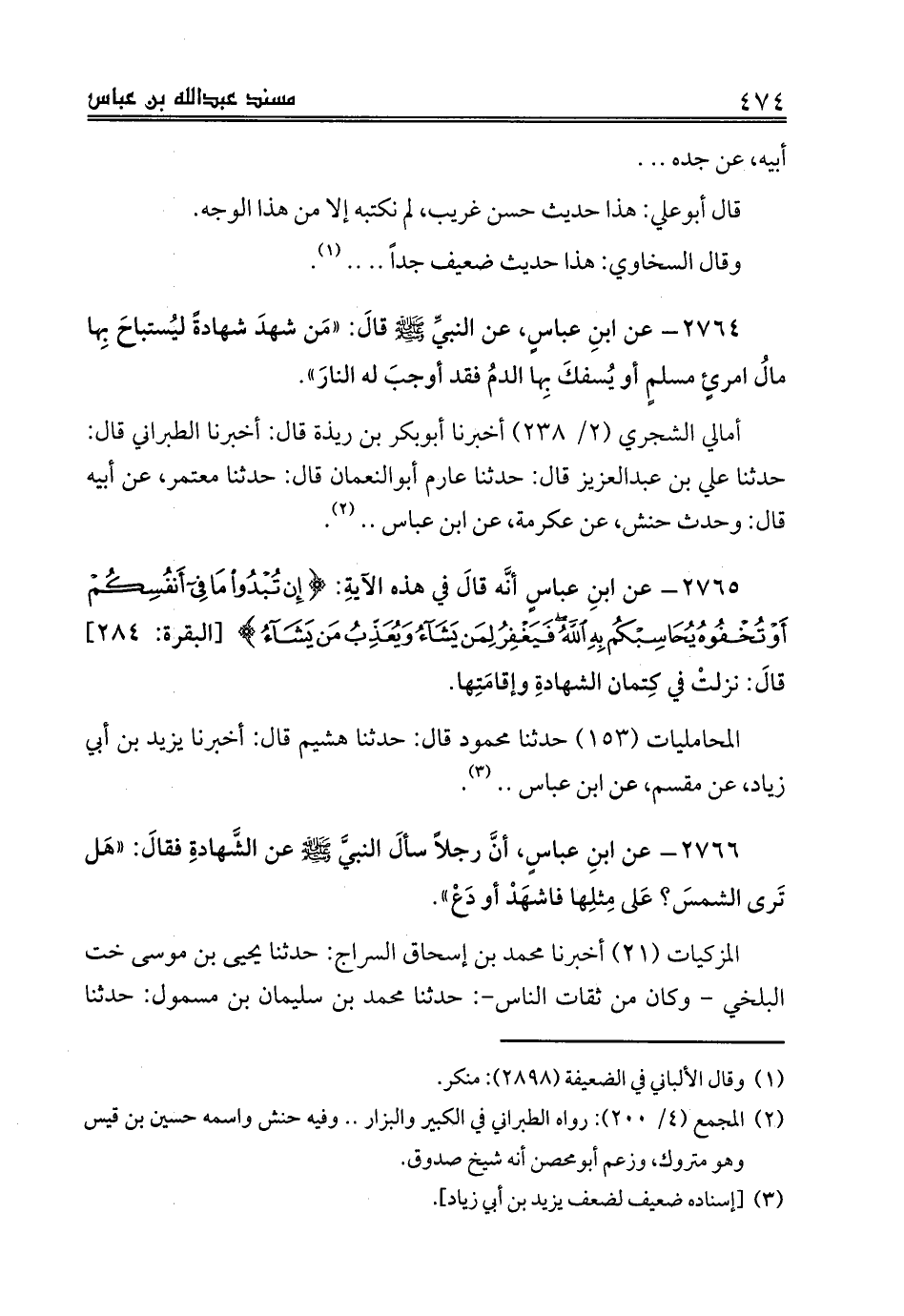 2765 - عن ابنِ عباسٍ أنَّه قالَ في هذه الآيةِ: {وَإِنْ تُبْدُوا مَا فِي أَنْفُسِكُمْ أَوْ تُخْفُوهُ يُحَاسِبْكُمْ بِهِ اللَّهُ فَيَغْفِرُ لِمَنْ يَشَاءُ وَيُعَذِّبُ مَنْ يَشَاءُ} [البقرة: 284] قالَ: نزلتْ في كِتمان الشهادةِ وإقامَتِها.