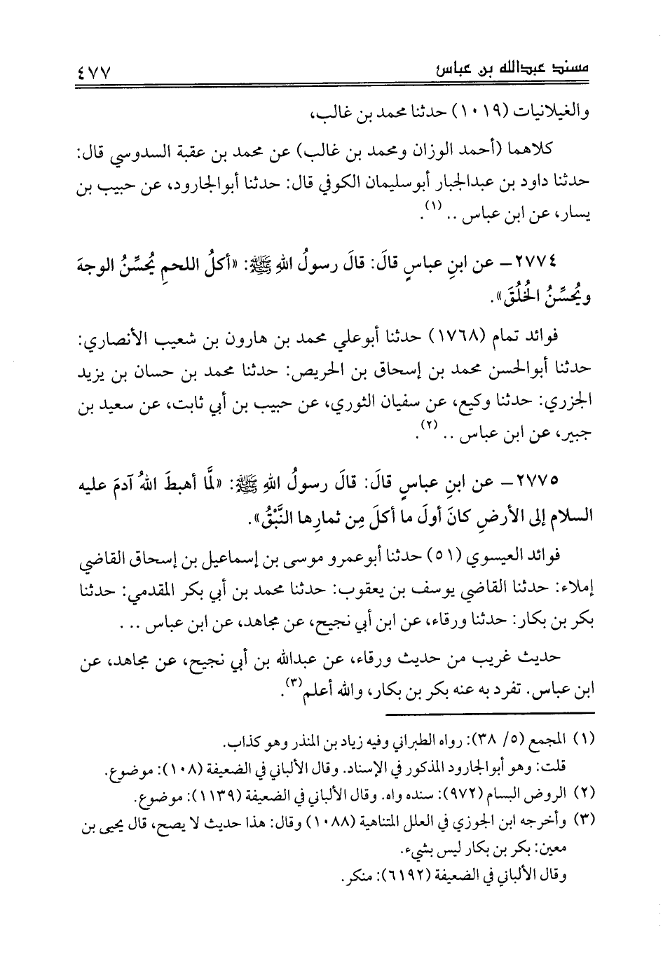 2774 - عن ابنِ عباسٍ قالَ: قالَ رسولُ اللهِ صلى الله عليه وسلم: «أكلُ اللحمِ يُحسِّنُ الوجهَ ويُحسِّنُ الخُلُقَ».
