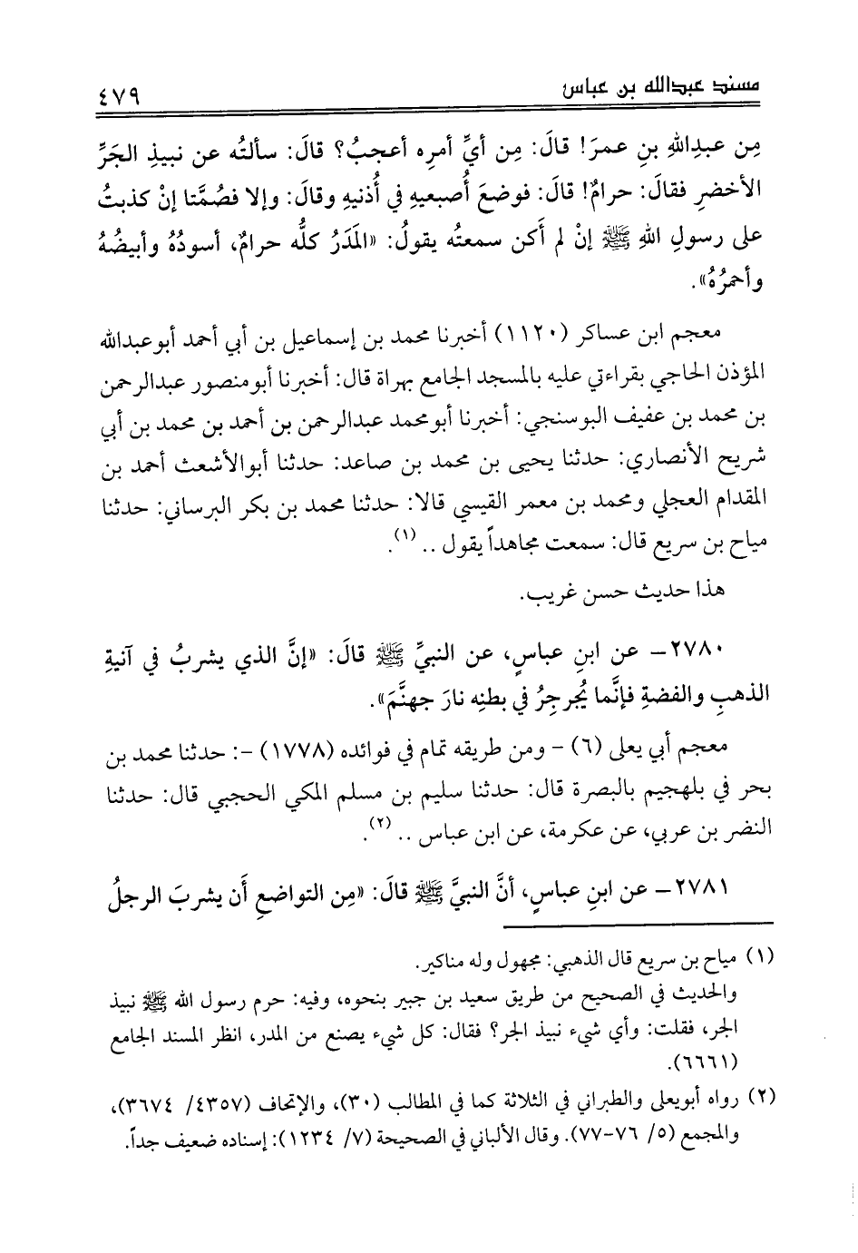 2780 - عن ابنِ عباسٍ، عن النبيِّ صلى الله عليه وسلم قالَ: «إنَّ الذي يشربُ في آنيةِ الذهبِ والفضةِ فإنَّما يُجرجِرُ في بطنِه نارَ جهنَّمَ».