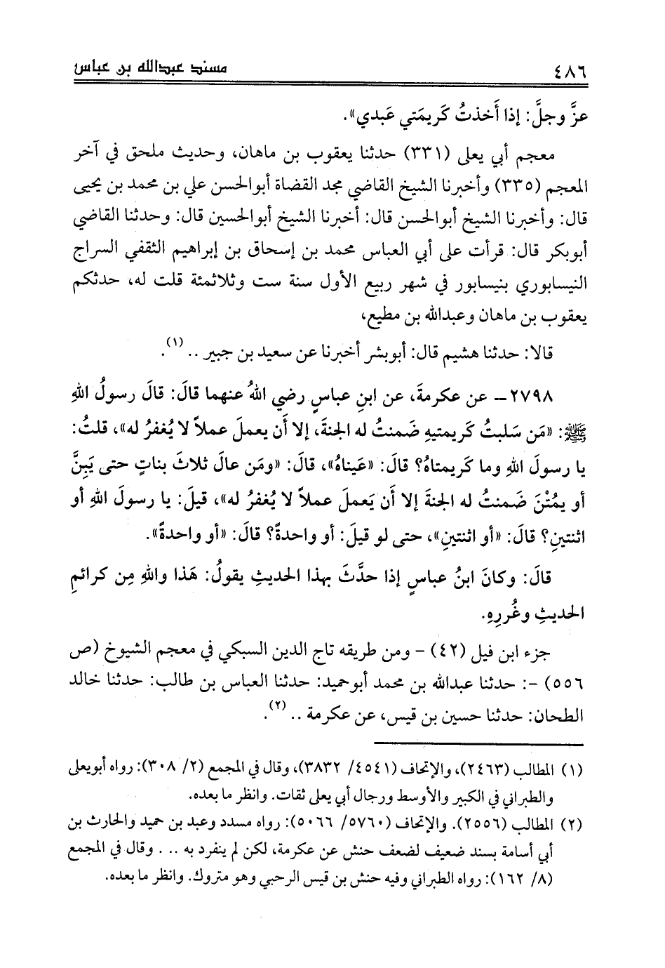 (¬2) المطالب (2556). والإتحاف (5760/ 5066): رواه مسدد وعبد بن حميد والحارث بن أبي أسامة بسند ضعيف لضعف حنش عن عكرمة، لكن لم ينفرد به .. . وقال في المجمع (8/ 162): رواه الطبراني وفيه حنش بن قيس الرحبي وهو متروك. وانظر ما بعده.