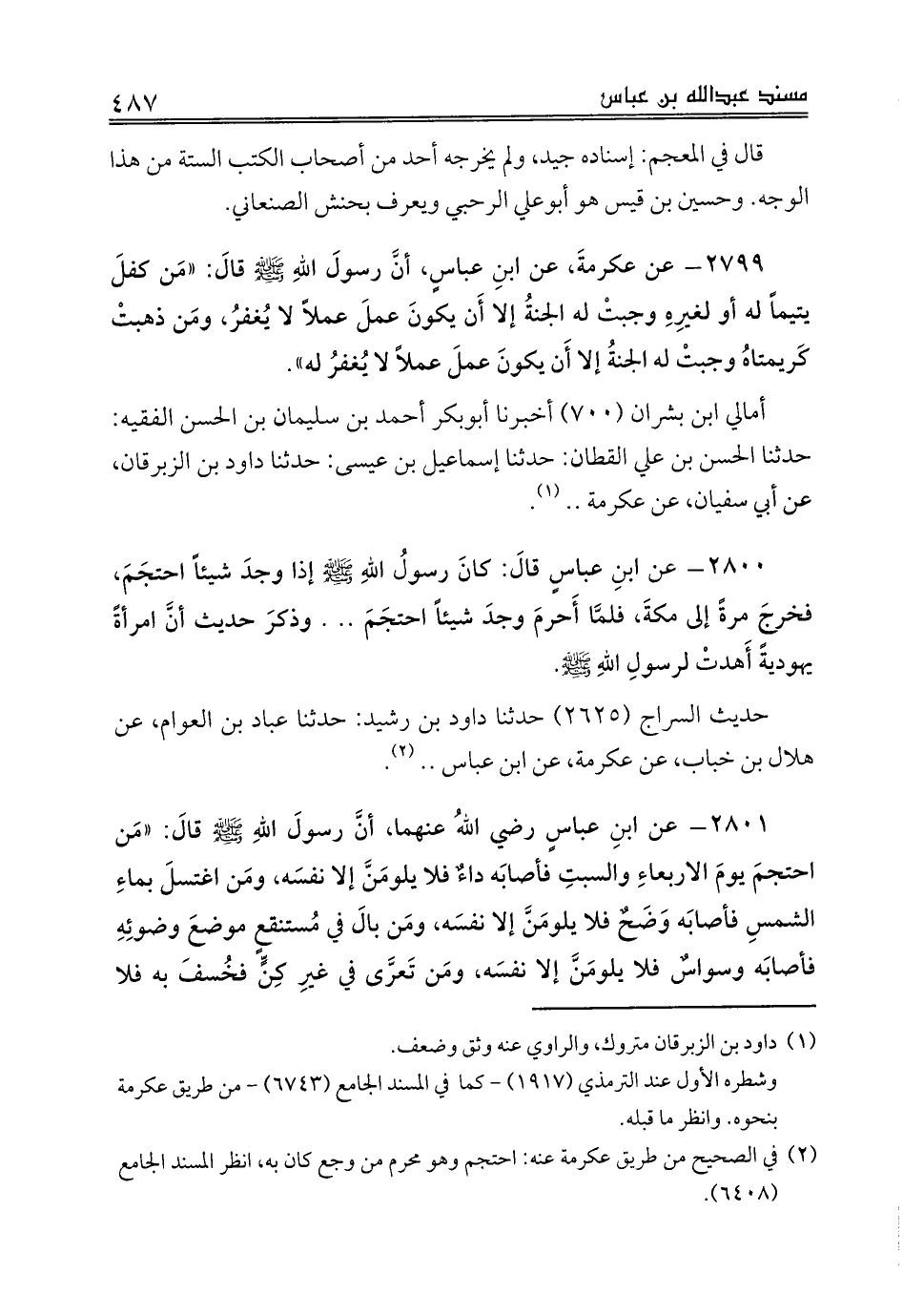 (¬2) في الصحيح من طريق عكرمة عنه: احتجم وهو محرم من وجع كان به، انظر المسند الجامع (6408).