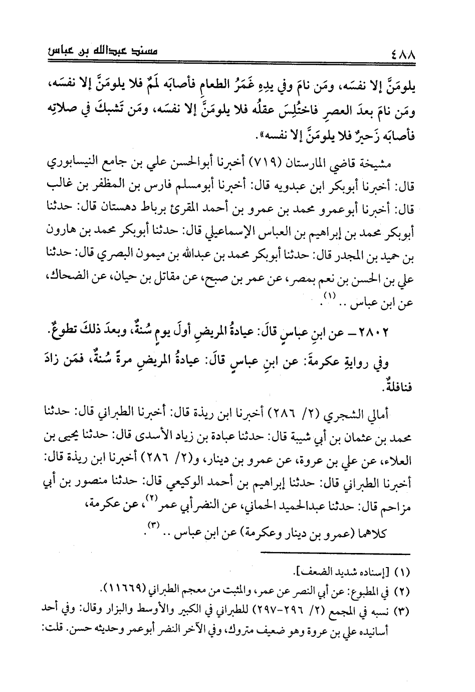 2802 - عن ابنِ عباسٍ قالَ: عيادةُ المريضِ أولَ يومٍ سُنةٌ، وبعدَ ذلكَ تطوعٌ.