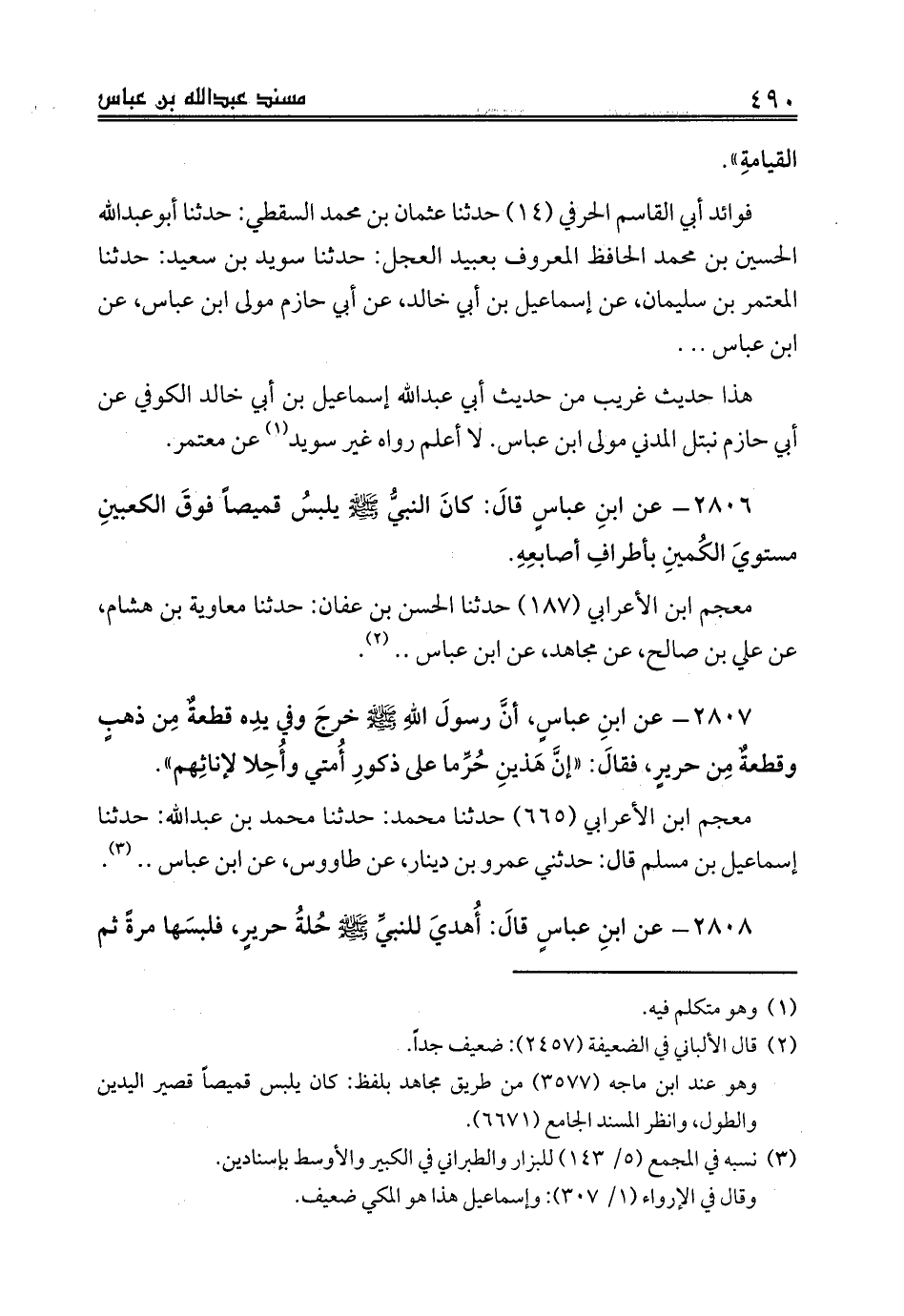 فوائد أبي القاسم الحرفي (14) حدثنا عثمان بن محمد السقطي: حدثنا أبوعبدالله الحسين بن محمد الحافظ المعروف بعبيد العجل: حدثنا سويد بن سعيد: حدثنا المعتمر بن سليمان، عن إسماعيل بن أبي خالد، عن أبي حازم مولى ابن عباس، عن ابن عباس .. .