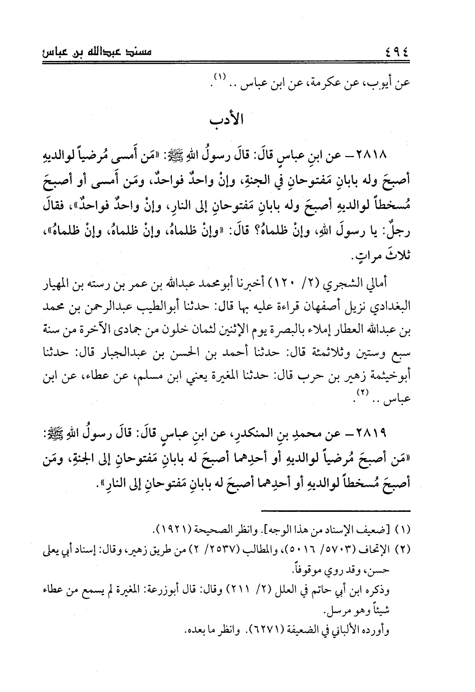 2819 - عن محمدِ بنِ المنكدرِ، عن ابنِ عباسٍ قالَ: قالَ رسولُ اللهِ صلى الله عليه وسلم: «مَن أصبحَ مُرضياً لوالديهِ أو أحدِهما أصبحَ له بابانِ مَفتوحانِ إلى الجنةِ، ومَن أصبحَ مُسخطاً لوالديهِ أو أحدِهما أصبحَ له بابانِ مَفتوحانِ إلى النارِ».