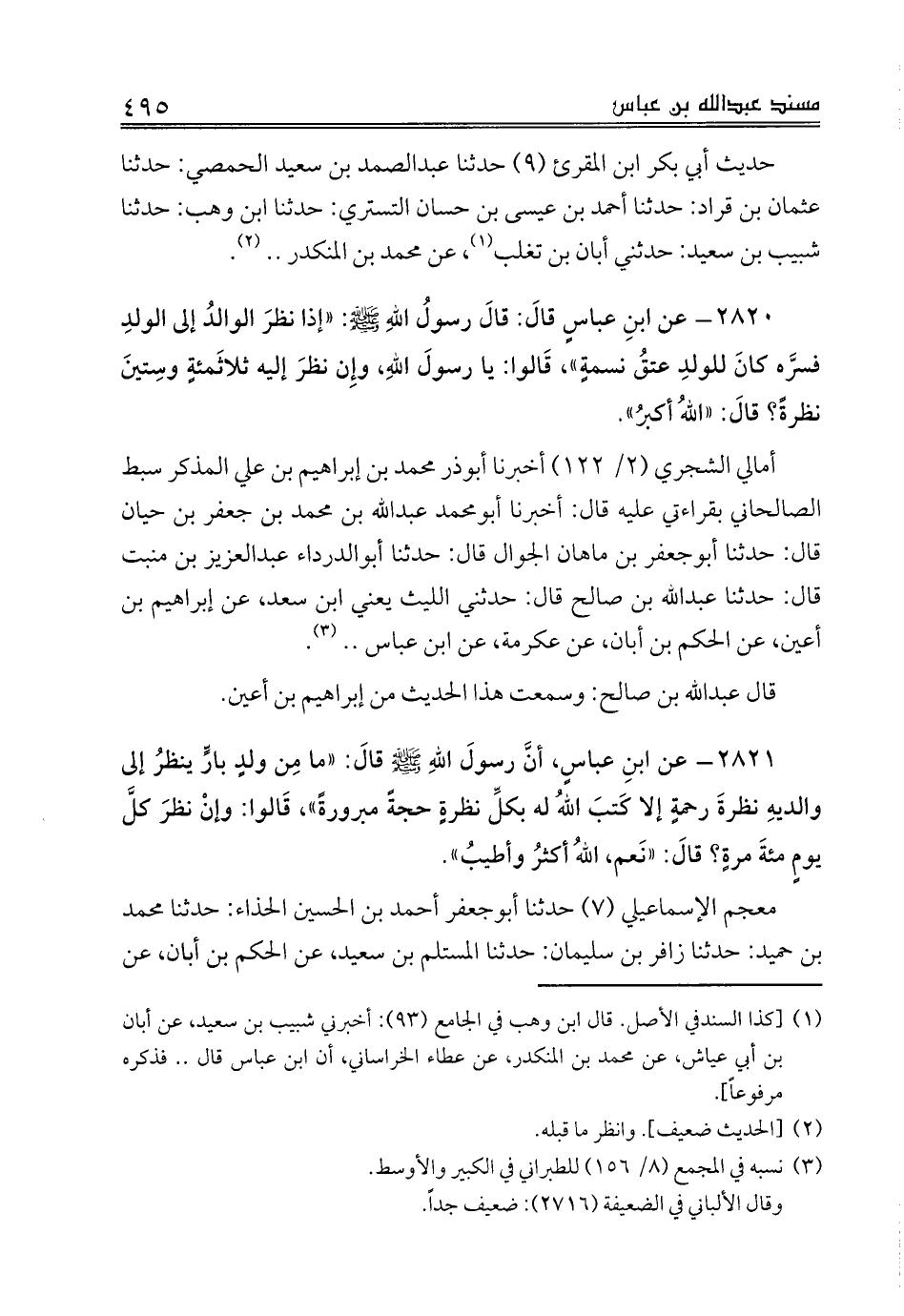 2820 - عن ابنِ عباسٍ قالَ: قالَ رسولُ اللهِ صلى الله عليه وسلم: «إذا نظرَ الوالدُ إلى الولدِ فسرَّه كانَ للولدِ عتقُ نسمةٍ»، قَالوا: يا رسولَ اللهِ، وإِن نظرَ إليه ثلاثَمئةٍ وسِتينَ نظرةً؟ قالَ: «اللهُ أكبرُ».