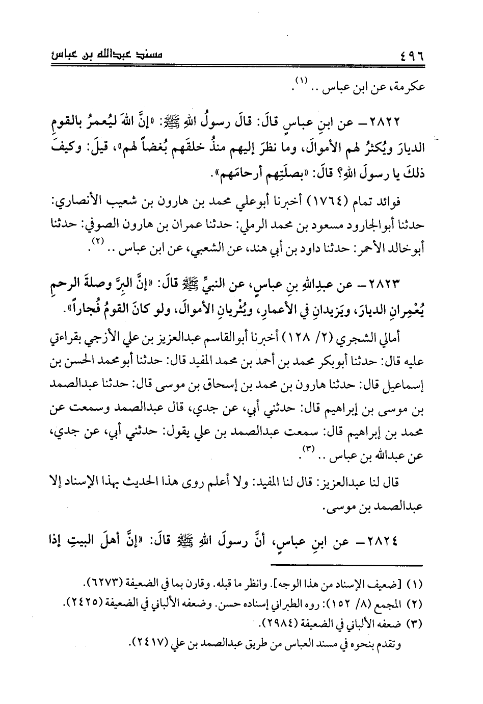 2822 - عن ابنِ عباسٍ قالَ: قالَ رسولُ اللهِ صلى الله عليه وسلم: «إنَّ اللهَ ليُعمرُ بالقومِ الديارَ ويُكثرُ لهم الأموالَ، وما نظرَ إليهم منذُ خلقَهم بُغضاً لهم»، قيلَ: وكيفَ ذلكَ يا رسولَ اللهِ؟ قالَ: «بصلَتِهم أرحامَهم».