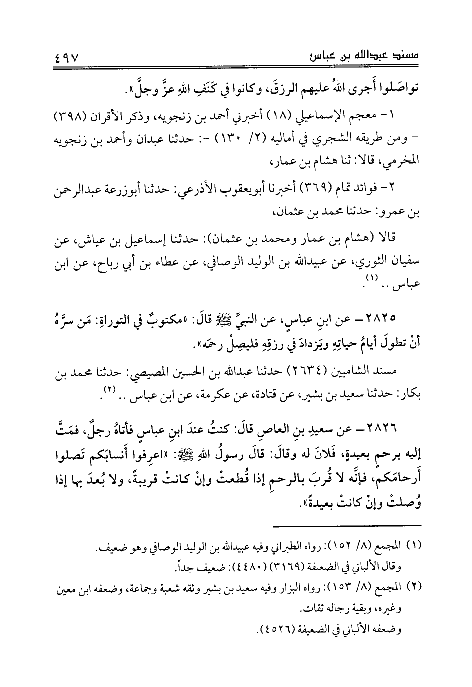 2825 - عن ابنِ عباسٍ، عن النبيِّ صلى الله عليه وسلم قالَ: «مكتوبٌ في التوراةِ: مَن سرَّهُ أنْ تطولَ أيامُ حياتِهِ ويَزدادَ في رزقِهِ فليصِلْ رحمَه».