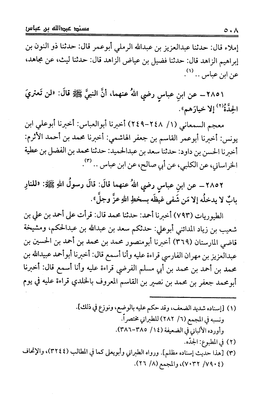 إملاء قال: حدثنا عبدالعزيز بن عبدالله الرملي أبوعمر قال: حدثنا ذو النون بن إبراهيم الزاهد قال: حدثنا فضيل بن عياض الزاهد قال: حدثنا ليث، عن مجاهد، عن ابن عباس .. (¬1).