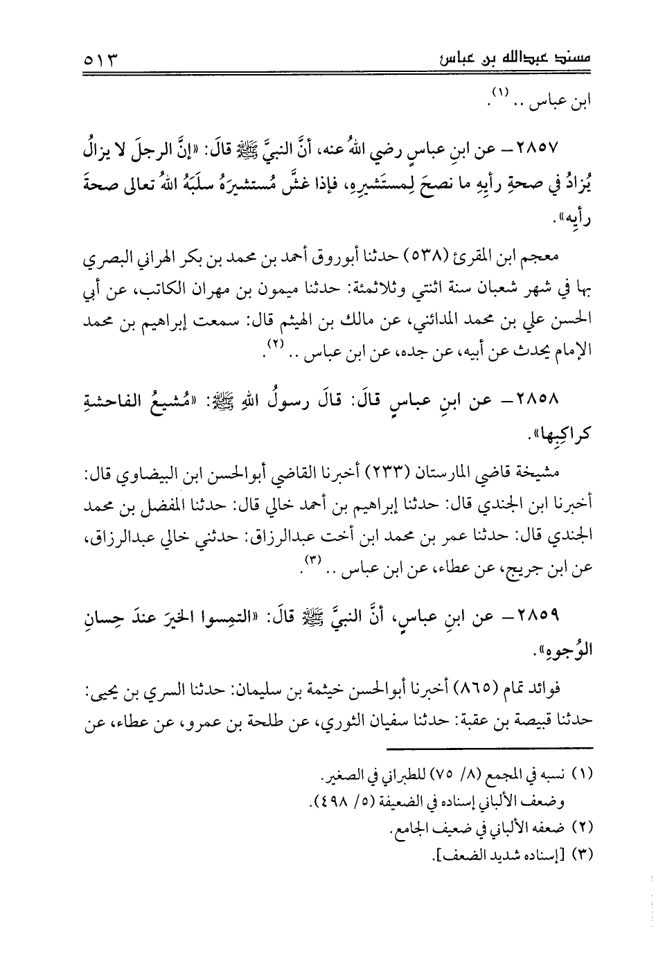 2858 - عن ابنِ عباسٍ قالَ: قالَ رسولُ اللهِ صلى الله عليه وسلم: «مُشيعُ الفاحشةِ كراكِبِها».