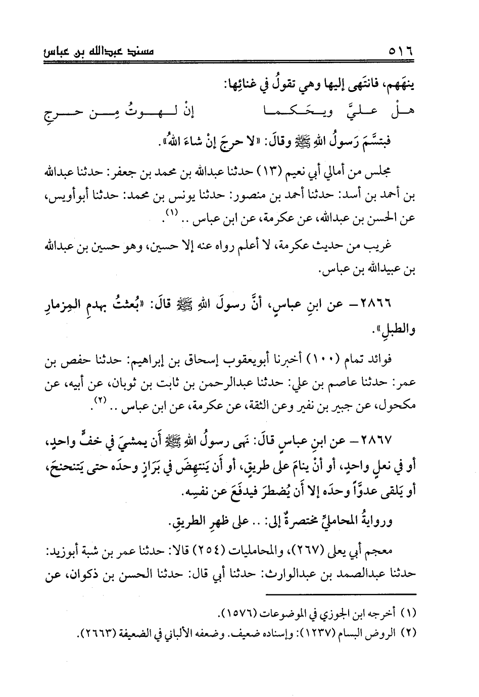2866 - عن ابنِ عباسٍ، أنَّ رسولَ اللهِ صلى الله عليه وسلم قالَ: «بُعثتُ بهدمِ المِزمارِ والطبلِ».