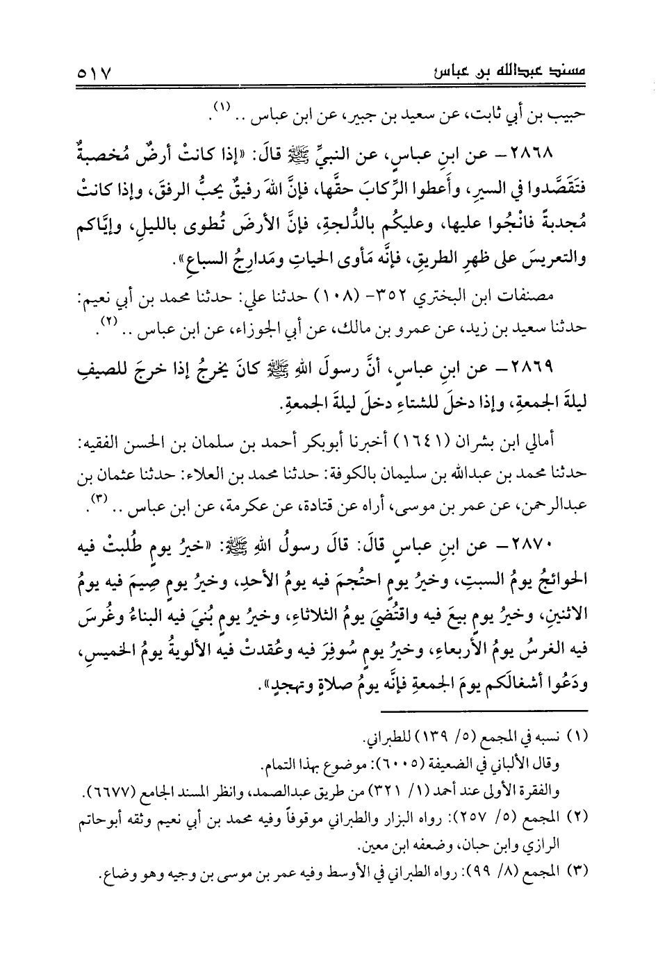 2870 - عن ابنِ عباسٍ قالَ: قالَ رسولُ اللهِ صلى الله عليه وسلم: «خيرُ يومٍ طُلبتْ فيه الحوائجُ يومُ السبتِ، وخيرُ يومٍ احتُجمَ فيه يومُ الأحدِ، وخيرُ يومٍ صِيمَ فيه يومُ الاثنينِ، وخيرُ يومٍ بيعَ فيه واقتُضيَ يومُ الثلاثاءِ، وخيرُ يومٍ بُنيَ فيه البناءُ وغُرسَ فيه الغرسُ يومُ الأربعاءِ، وخيرُ يومٍ سُوفِرَ فيه وعُقدتْ فيه الألويةُ يومُ الخميسِ، ودَعُوا أشغالَكم يومَ الجمعةِ فإنَّه يومُ صلاةٍ وتهجدٍ».