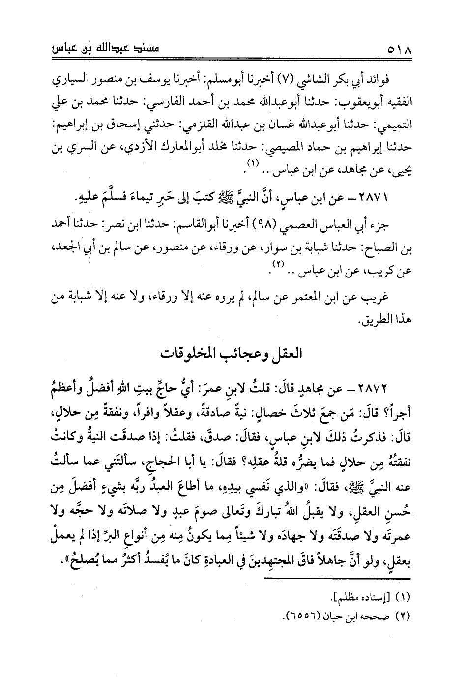 2872 - عن مجاهدٍ قالَ: قلتُ لابنِ عمرَ: أيُّ حاجِّ بيتِ اللهِ أفضلُ وأعظمُ أجراً؟ قالَ: مَن جمعَ ثلاثَ خصالٍ: نيةً صادقةً، وعقلاً وافراً، ونفقةً مِن حلالٍ، قالَ: فذكرتُ ذلكَ لابنِ عباسٍ، فقالَ: صدقَ، فقلتُ: إذا صدقَت النيةُ وكانتْ نفقتُهُ مِن حلالٍ فما يضرُّه قلةُ عقلِه؟ فقالَ: يا أبا الحجاجِ، سألتَني عما سألتُ عنه النبيَّ صلى الله عليه وسلم، فقالَ: «والذي نَفسي بيدِهِ، ما أطاعَ العبدُ ربَّه بشيءٍ أفضلَ مِن حُسنِ العقلِ، ولا يقبلُ اللهُ تباركَ وتَعالى صومَ عبدٍ ولا صلاتَه ولا حجَّه ولا عمرتَه ولا صدقَتَه ولا جهادَه ولا شيئاً مِما يكونُ مِنه مِن أنواعِ البرِّ إذا لم يعملْ بعقلٍ، ولو أنَّ جاهلاً فاقَ المجتهِدينَ في العبادةِ كانَ ما يُفسدُ أكثرُ مما يُصلحُ».