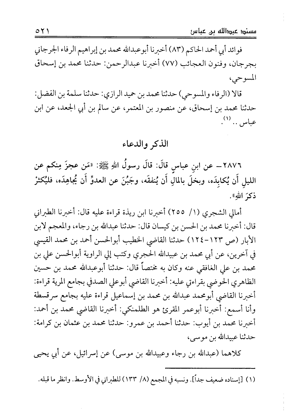 2876 - عن ابنِ عباسٍ قالَ: قالَ رسولُ اللهِ صلى الله عليه وسلم: «مَن عجزَ مِنكم عن الليلِ أَن يُكابِدَه، وبخلَ بالمالِ أَن يُنفقَه، وجَبُنَ عن العدوِّ أَن يُجاهِدَه، فليُكثرْ ذكرَ اللهِ».