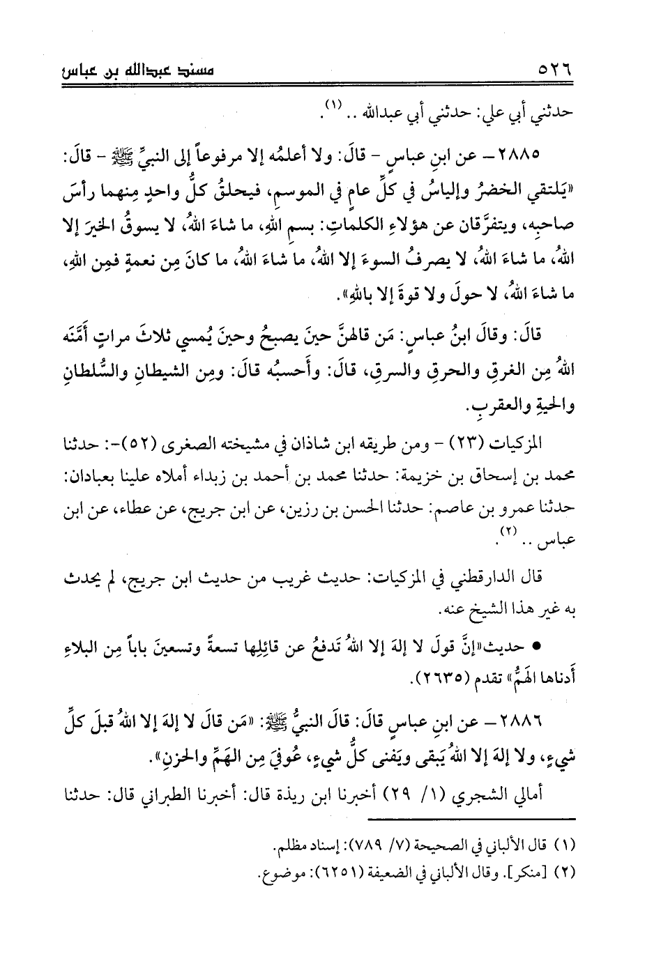 2885 - عن ابنِ عباسٍ - قالَ: ولا أعلمُه إلا مرفوعاً إلى النبيَّ صلى الله عليه وسلم - قالَ: «يَلتقي الخضرُ وإلياسُ في كلِّ عامٍ في الموسمِ، فيحلقُ كلُّ واحدٍ مِنهما رأسَ صاحبِه، ويتفرَّقان عن هؤلاءِ الكلماتِ: بسمِ اللهِ، ما شاءَ اللهُ، لا يسوقُ الخيرَ إلا اللهُ، ما شاءَ اللهُ، لا يصرفُ السوءَ إلا اللهُ، ما شاءَ اللهُ، ما كانَ مِن نعمةٍ فمِن اللهِ، ما شاءَ اللهُ، لا حولَ ولا قوةَ إلا باللهِ».